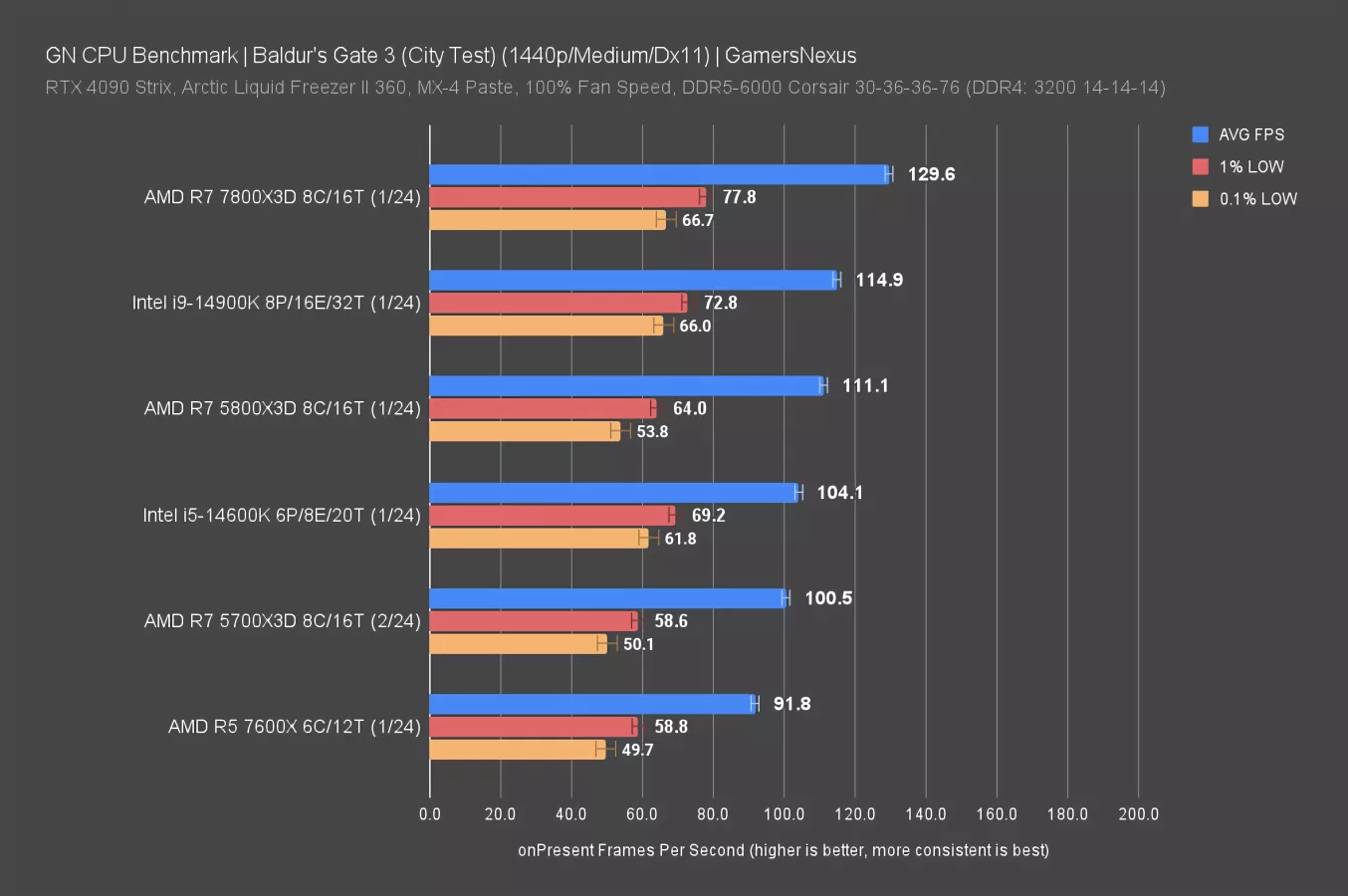 Baldur’s Gate 3 has also received multiple massive patches since our October data set. We found that CPU performance was typically around 5% different from previously at the upper-bound of the testing, or 2-3% at the lower. Because of the 5% swing in some scenarios, this chart contains only directly comparable data that has been run on the newest game version.