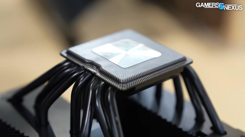 Moving on to the vapor chamber itself, DeepCool is saying that it’s tuned for Intel CPUs, but it will work on AMD CPUs as well. We asked about curvature on the coldplate, and the company told us it has a “ridge bump” pattern. That likely comes from the structure of vapor chambers themselves, which have internal copper support columns. Those columns can be evident in the surface of the coldplate as small deformations.