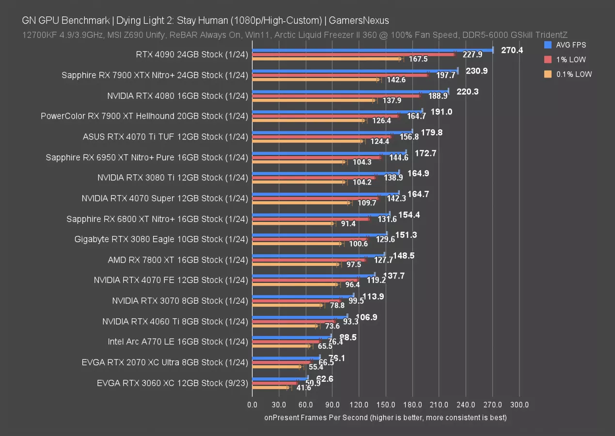 In Dying Light 2 with high RT and DLSS quality or equivalent settings for FSR and XeSS, we end up with this chart. The RTX 4070 Super held 43 FPS AVG here, showing that these cards actually need upscaling to run with these settings. The 4070 Ti leads it by 12%, with the Super card leading the 4070 FE by 19% and the 3070 by 54%. These numbers are similar to what we saw when rasterized, painting no meaningful deviation between these NVIDIA devices with RT and DLSS. The AMD cards tumble down the stack some more, with the 7900 XTX now equivalent to the 4070 Ti and the 7900 XT closer to the 3080 when both are using upscaling.