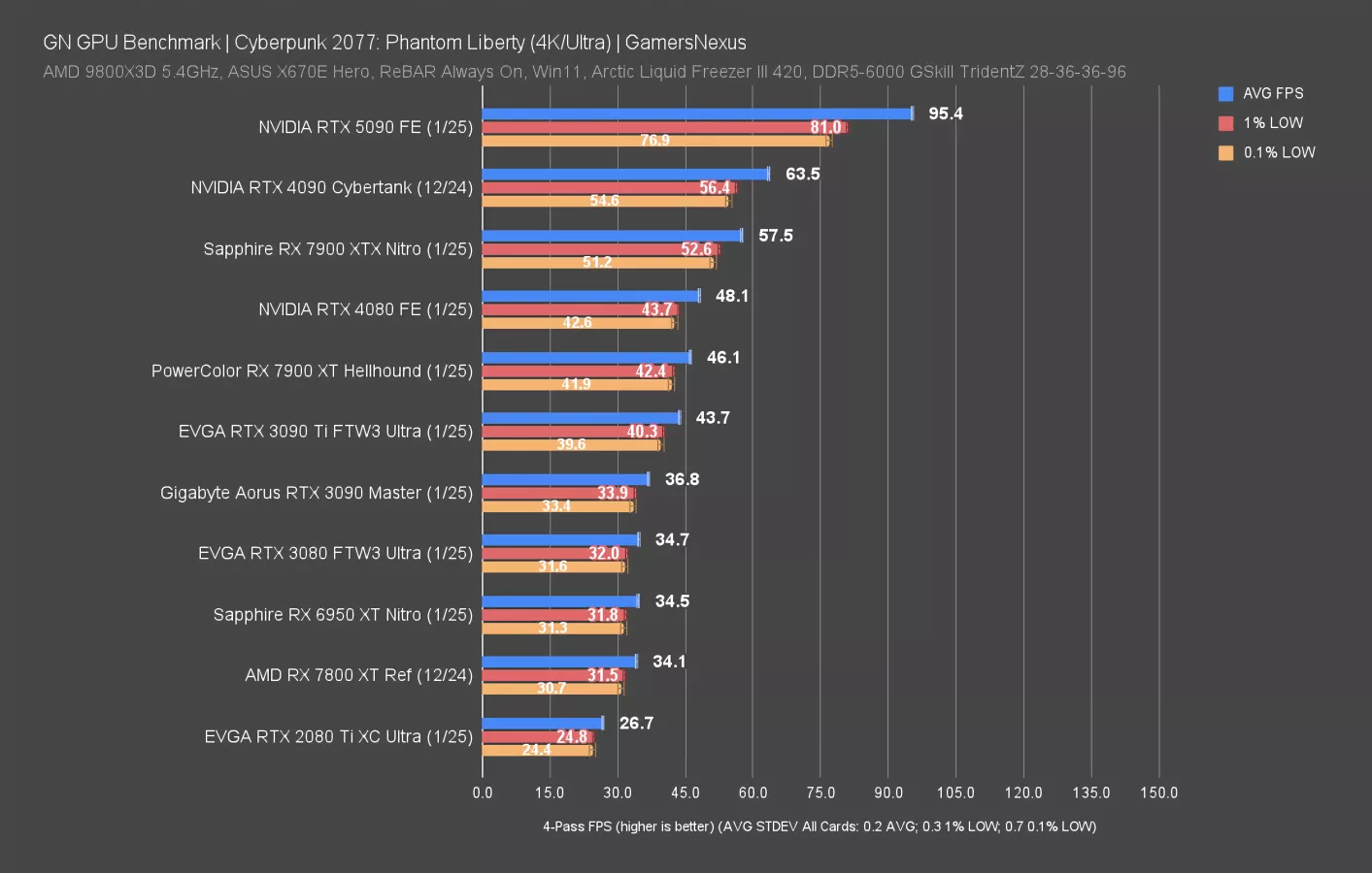 The 5090 has a 51% higher average framerate than the 7900 XTX, 75% higher than the 3090 Ti FTW3 (RIP EVGA), 99% higher than the RTX 3090 Master, and 189% higher than the RTX 2080 Ti former flagship.
