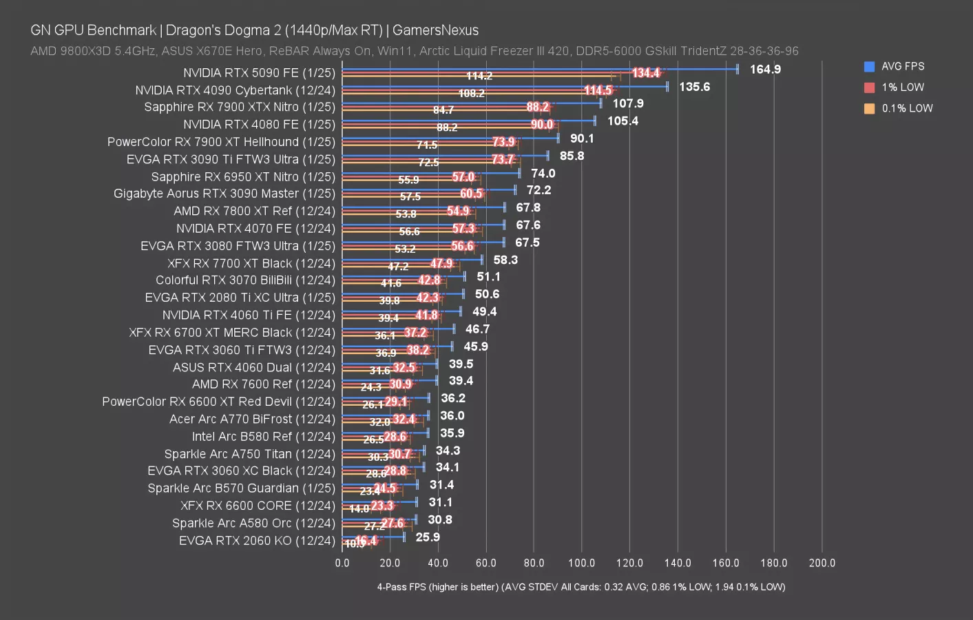 At 1440p, the 5090 jumped to 165 FPS AVG and the 4090 held 136 FPS AVG, still keeping about a 30 FPS gap between them, or an improvement generationally of 22%. The uplift has fallen as compared to 4K, keeping with prior trends. The 7900 XTX does similarly here to last time, landing just ahead of the RTX 4080 (watch our review).