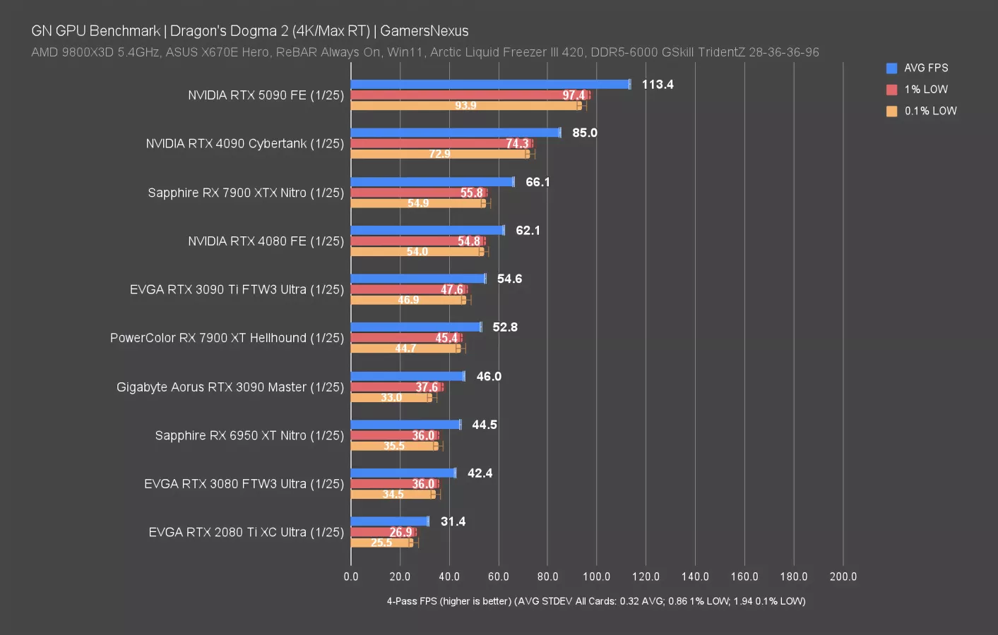 Dragon’s Dogma 2 is up next. Again, we haven’t done a ton of 4K Ray Tracing tests here because it’s such a heavy workload normally, but the RTX 5090 ran at 113 FPS AVG with lows at 97 FPS and 94 FPS. The 4090 landed at around 85 FPS AVG, giving the 5090 an uplift of 33%. The RX 7900 XTX does better in this game compared to Black Myth, instead outperforming the RTX 4080 and 3090 Ti, the latter of which is at 55 FPS AVG.