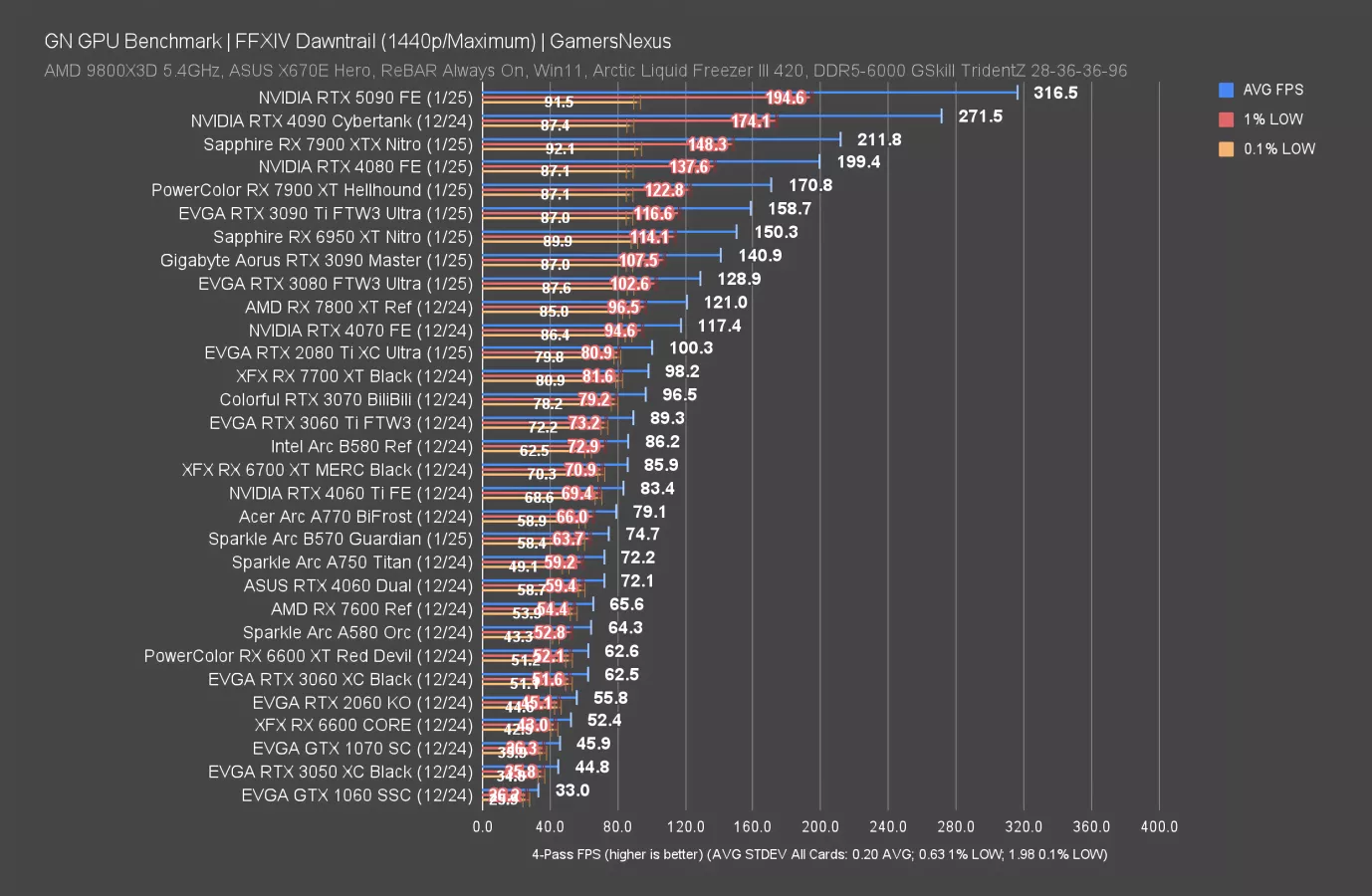 The 7900 XTX held on at 232 FPS AVG here, followed by cards like the 3090 Ti at 162 FPS and 2080 Ti at 92 FPS AVG.