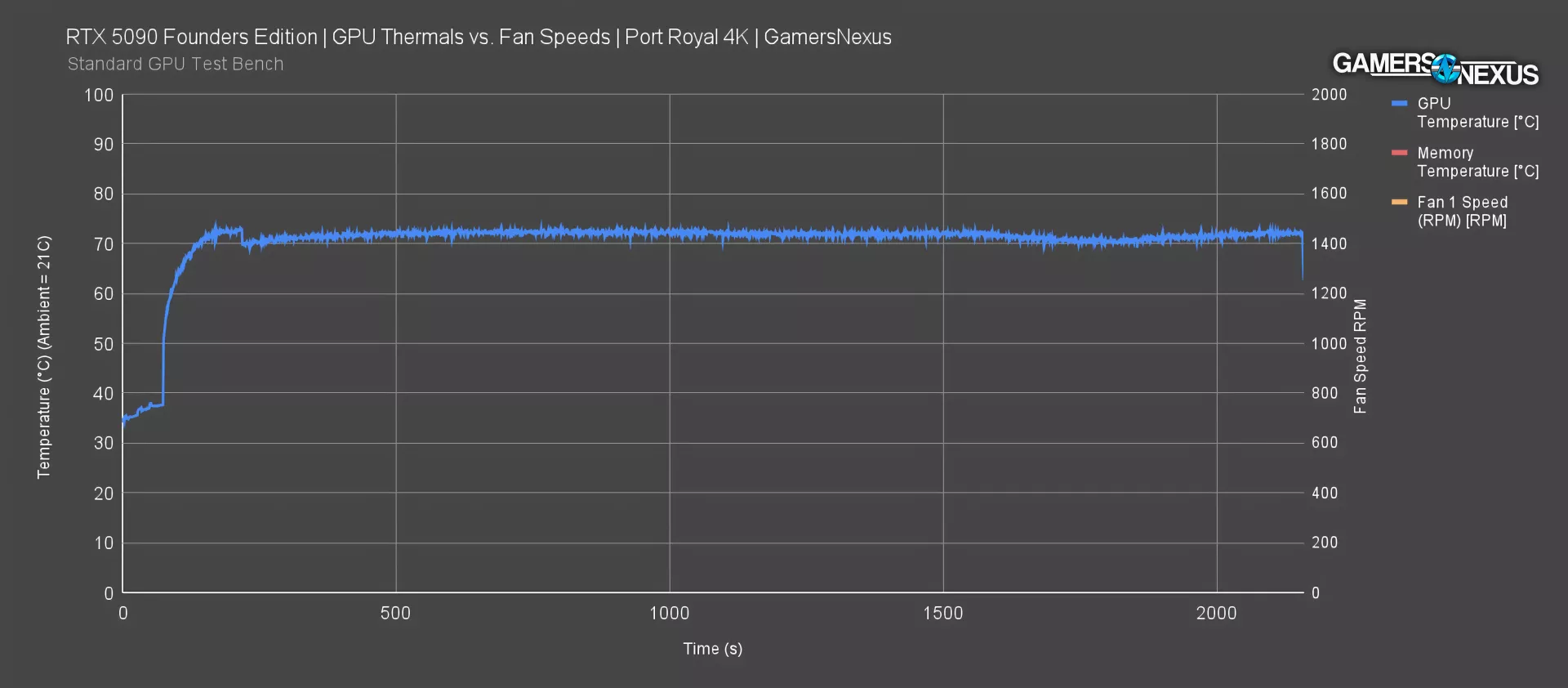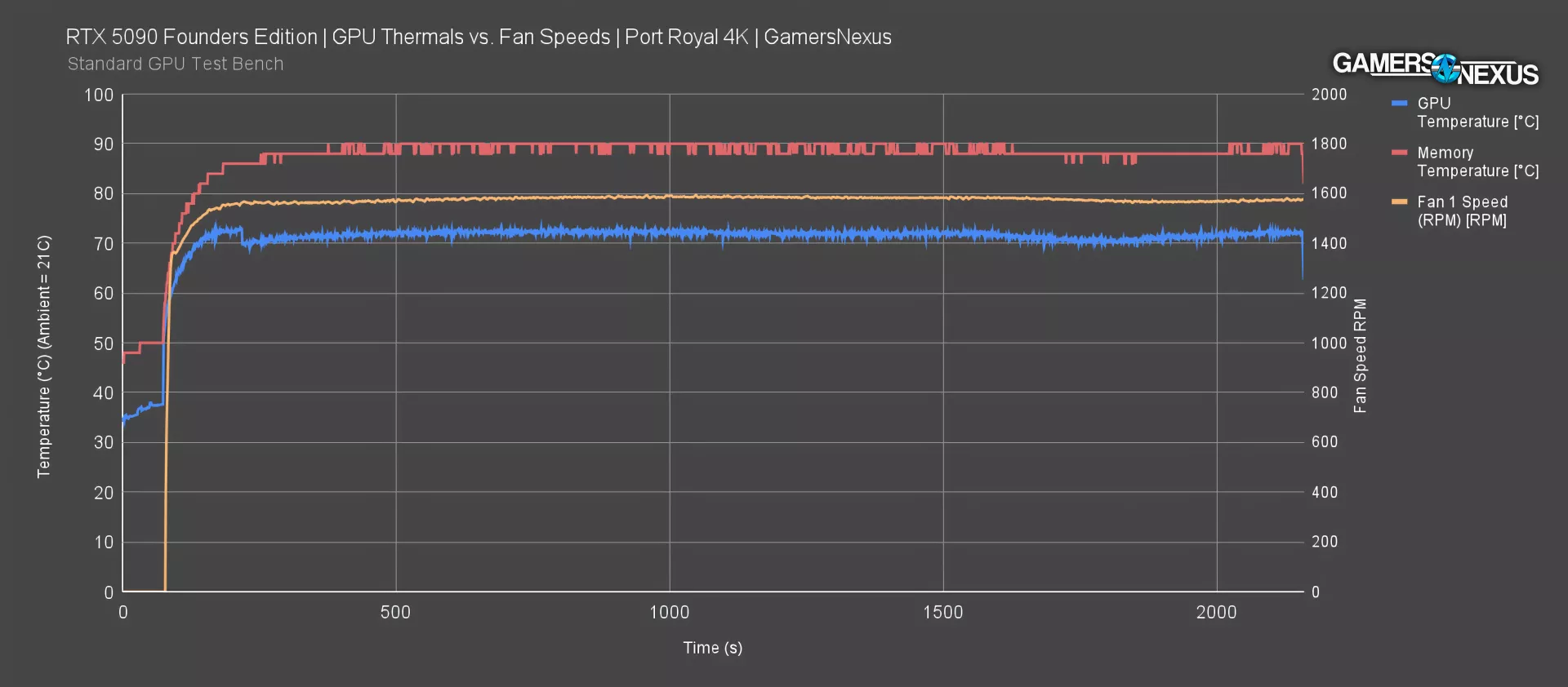 Here’s a thermal chart running the RTX 5090 under its auto VBIOS fan curve with a Port Royal RT stress test at 4K.