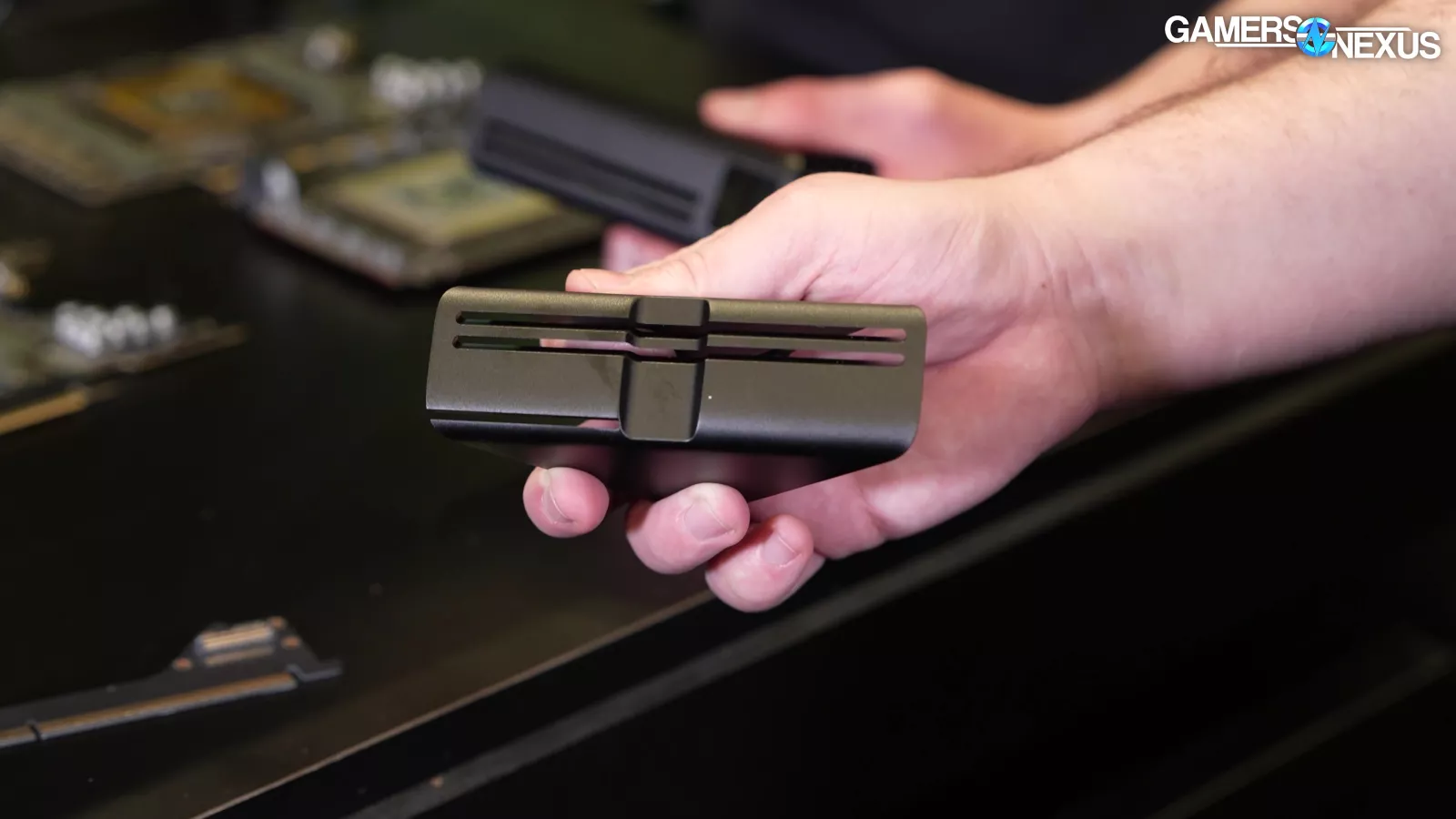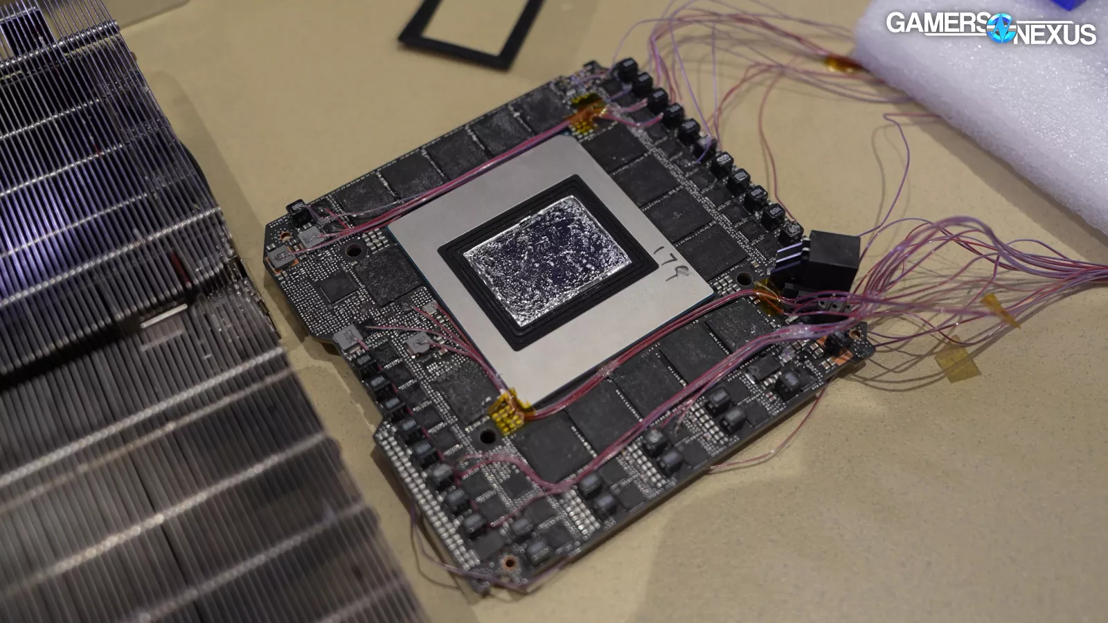 The RTX 5090 Founders Edition moves to a 2-slot design and uses a dual flow-through configuration, so they’ve sandwiched the PCB centrally and offset the PCIe slot to the side and down as a result. That also means that NVIDIA needs a separate PCB for the I/O that feeds monitors, connected via a flex cable to the main PCB. To get a 2-slot cooler capable of handling 575W or more, NVIDIA is using liquid metal with a triple-walled gasket to both contain the liquid metal and prevent exposure that could change its consistency and efficacy.