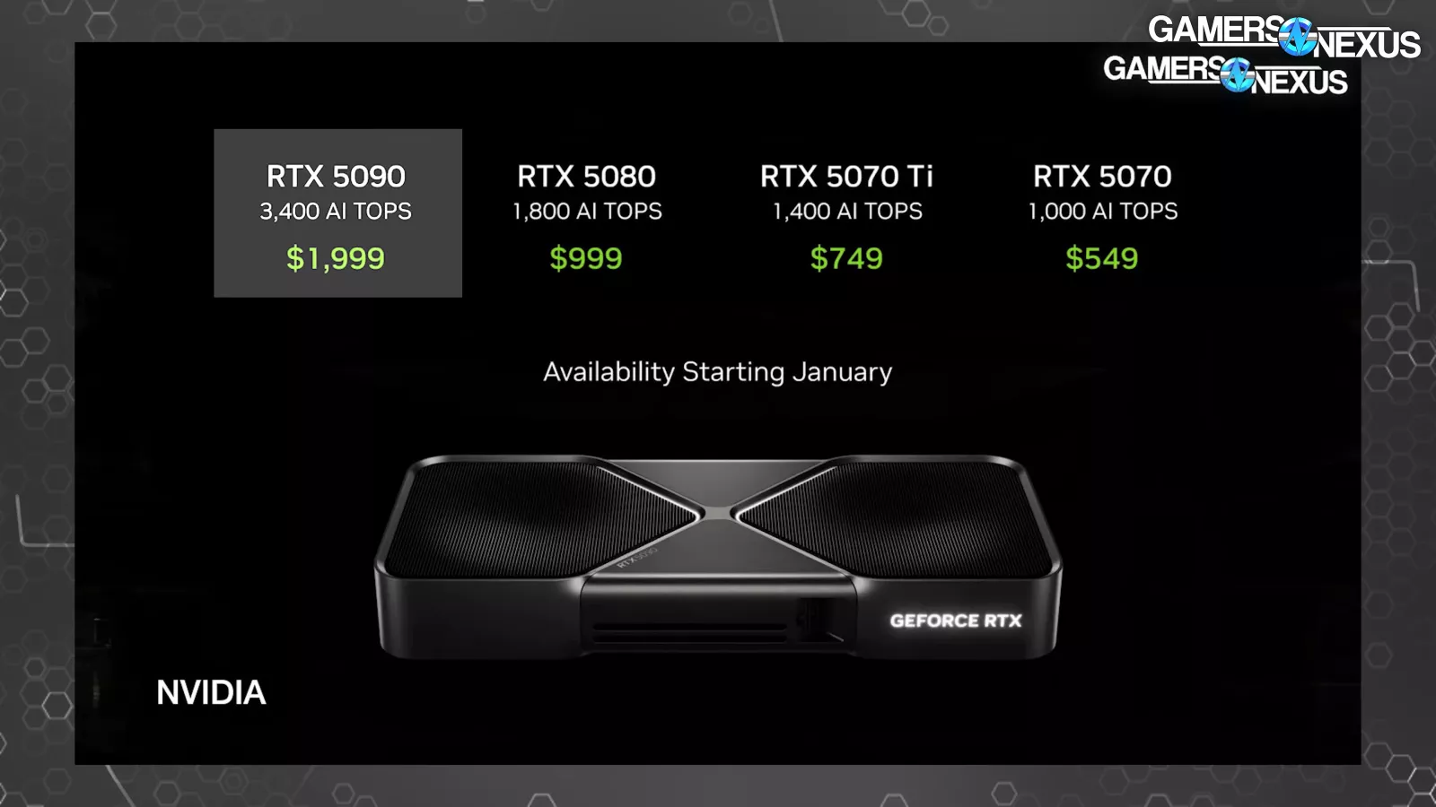 The NVIDIA RTX 5090 is supposed to be $2,000 and will have official availability on January 30th, joined by the $1,000 MSRP RTX 5080 on the same date. NVIDIA also has the 5070 Ti and 5070 launching in presumably February for $750 and $550.