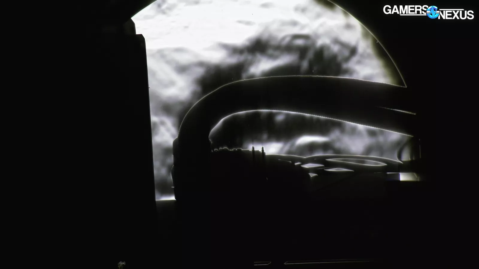 As the fans turn on, we see a sudden flare-up and movement of air to the right through the flow-through area out the back and toward the CPU tower. What's super cool here is that we can see the air kick up and out to the right at a 20-30 degree angle or so. We also see a really high flow area of air exiting from the fins at the outer edges of the heatsink design. This hyper focuses the flow and reduces recirculation around the front area of the card, which just means the whole design is incredibly efficient at getting air away from the board and into case exhaust fans.