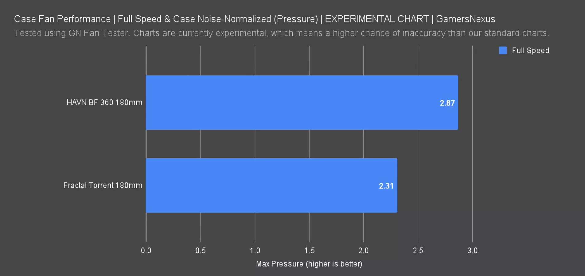 We had some pressure numbers as well, which we’re only presenting at full speed. This is just because we’re still studying how we want to present the rest of it. But for the full speed results, the Fractal Torrent had a 2.31 mm H2O for pressure performance. And the Haven BF360 was at 2.87. That is for the maximum mm H2O at full speed, which would mean the minimum flow in that test.