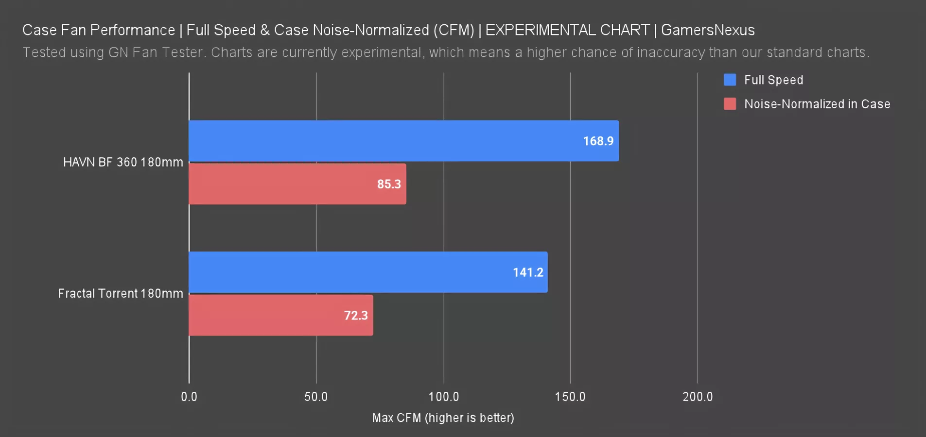 When running at noise-normalized case levels, we measured 85 CFM on the HAVN BF 360 and 72 CFM on the Torrent. The BF 360 fan is testing better in our initial tests here.
