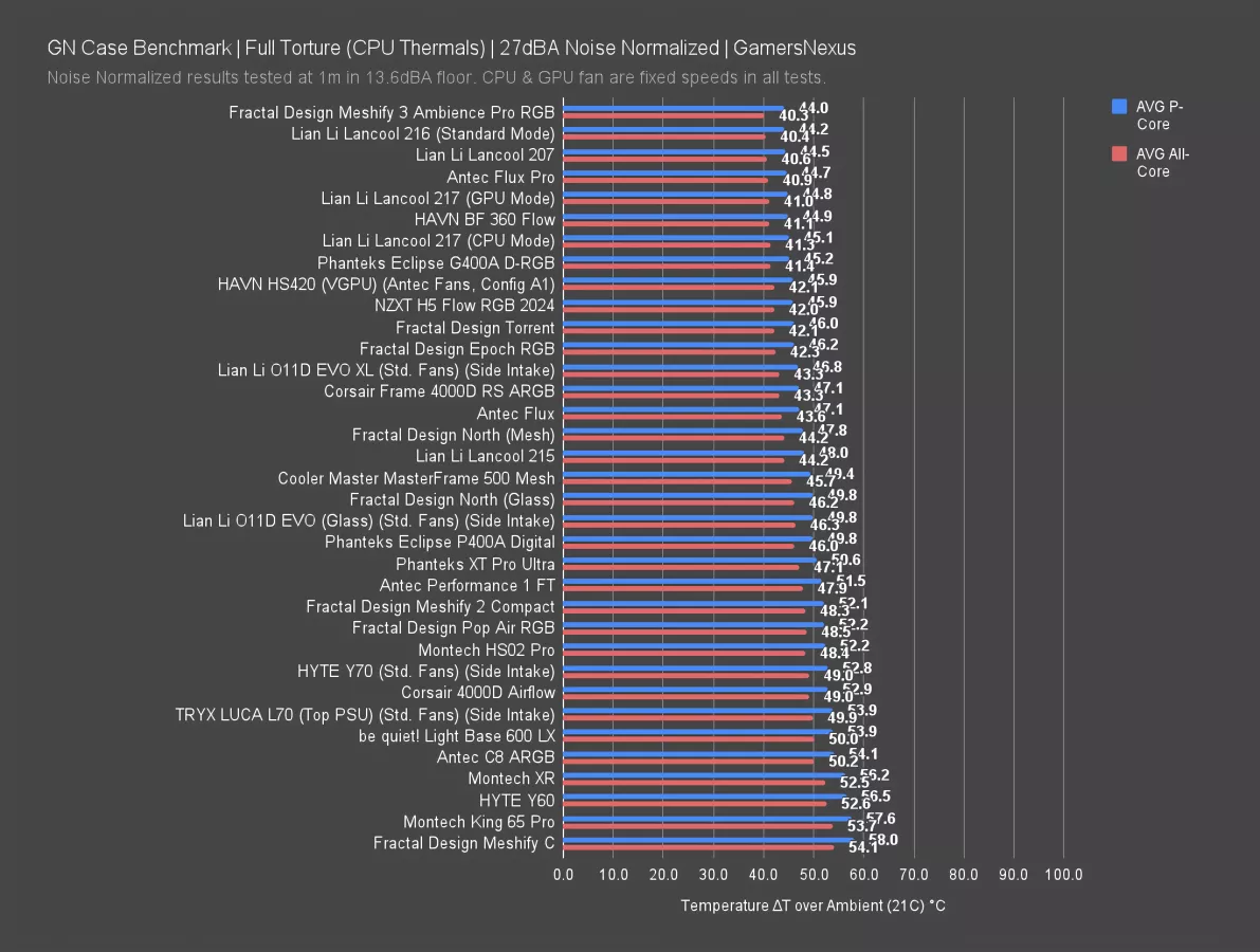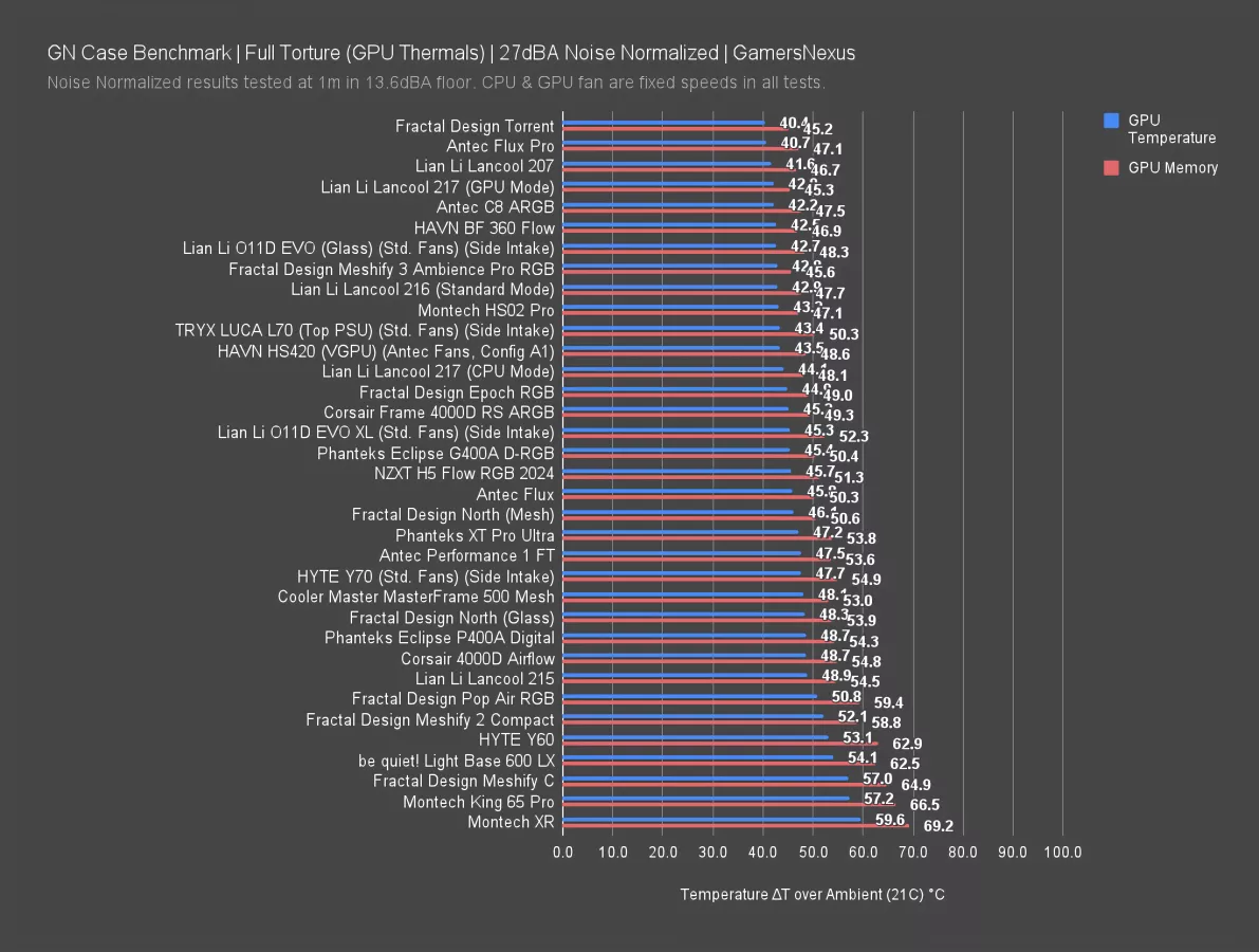 The 217 is tied with the BF 360 here, just like it was for CPU thermals, and the Meshify 3's relative placement is also the same at one degree warmer than the BF 360. Meanwhile, the Torrent is slightly cooler at 39 degrees.