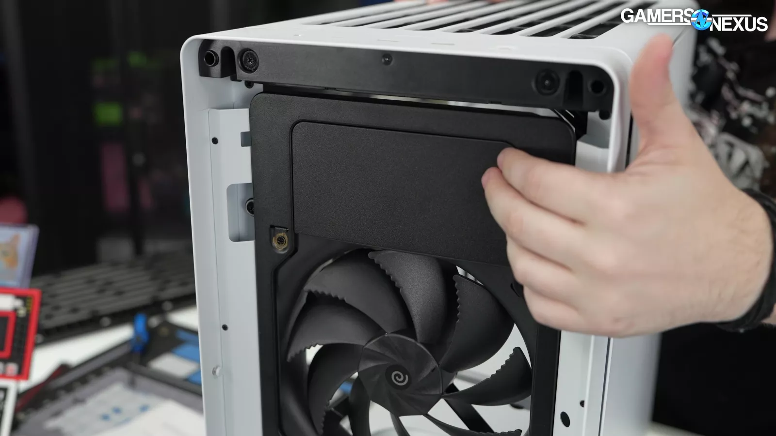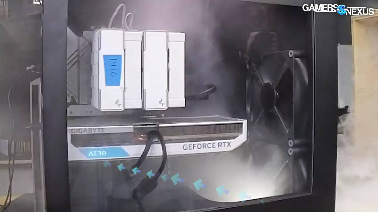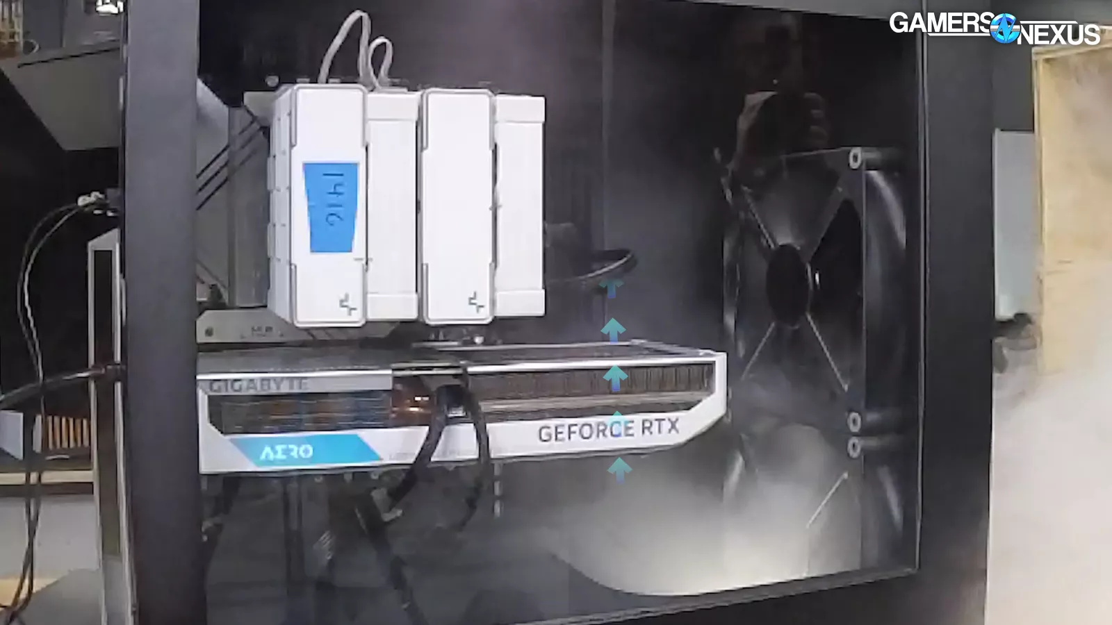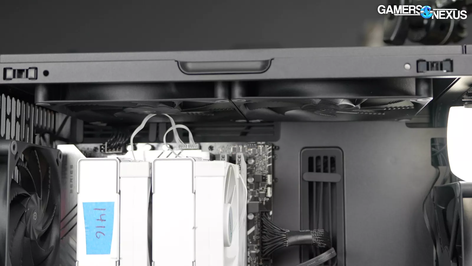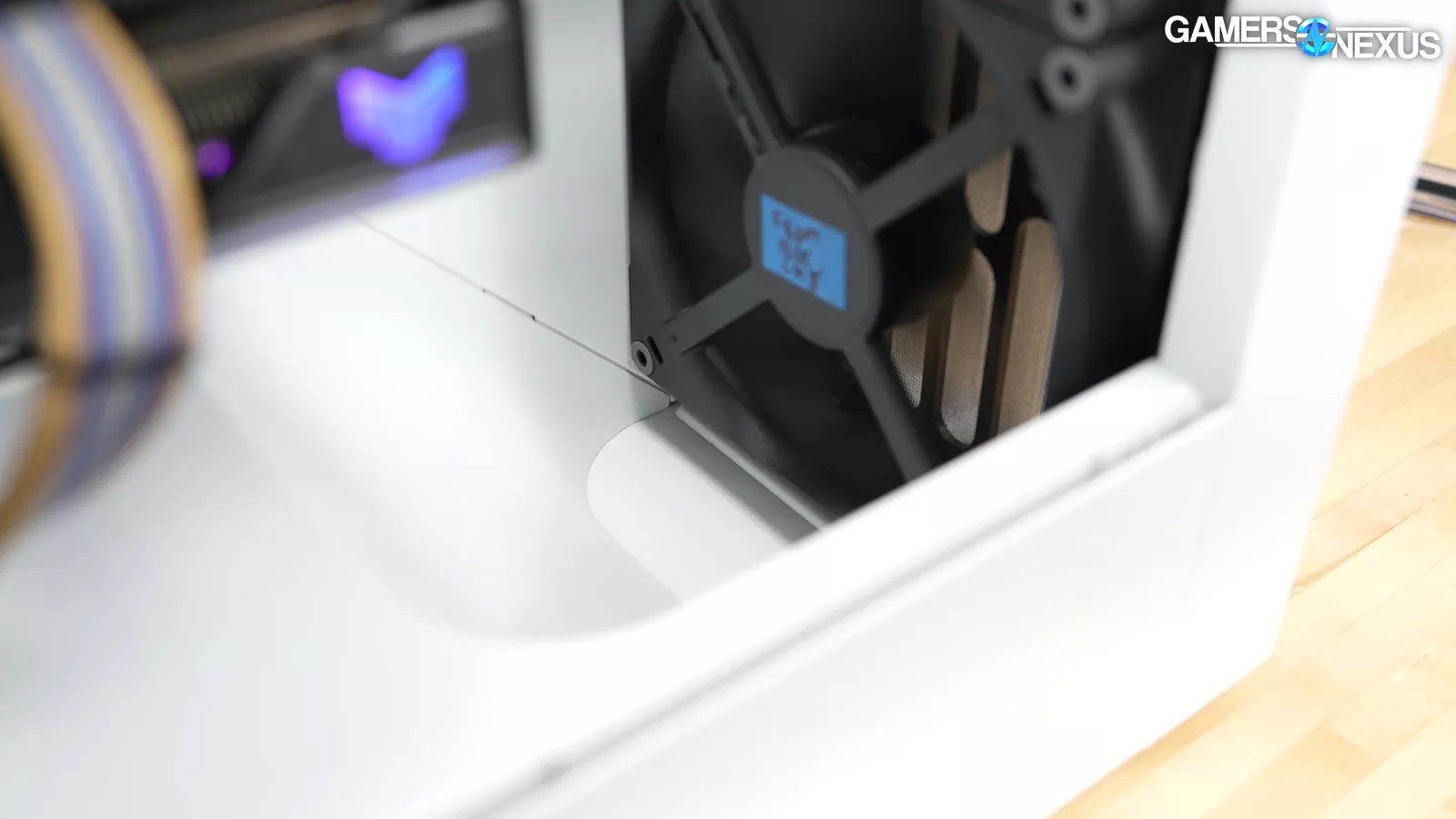 Meanwhile, the air going through the flow-through area is deflecting the top intake air up and away from the CPU cooler. This matches our testing during the 30-series of NVIDIA’s flow-through coolers. The CPU cooler ends up a little warmer as a result, and so does the CPU temperature, but this is the nature of flow-through coolers and not of the case itself. CPUs are low enough power compared to GPUs that they can typically handle it without meaningful change. As a result of the GPU's giant flow-through area, the case intake is being deflected up and toward the roof of the case. This is why GPU temperature goes up with a top-front intake fan, but CPU temperature goes down.