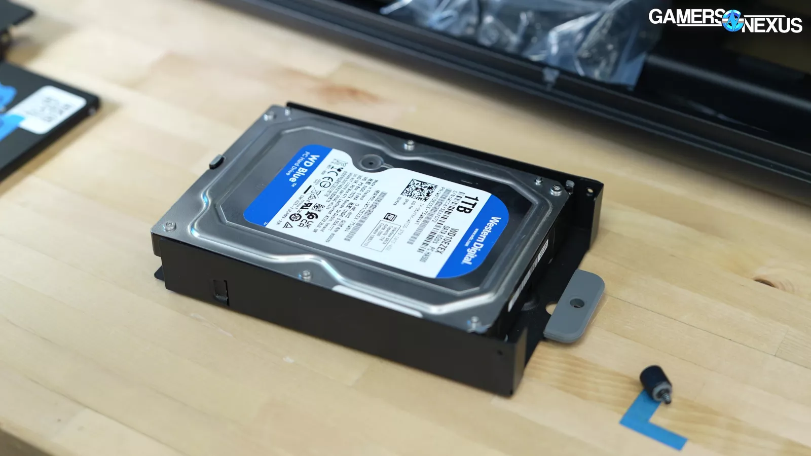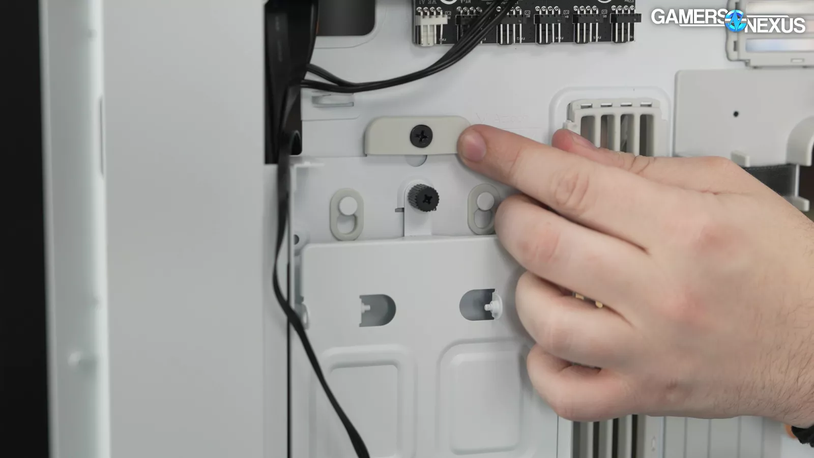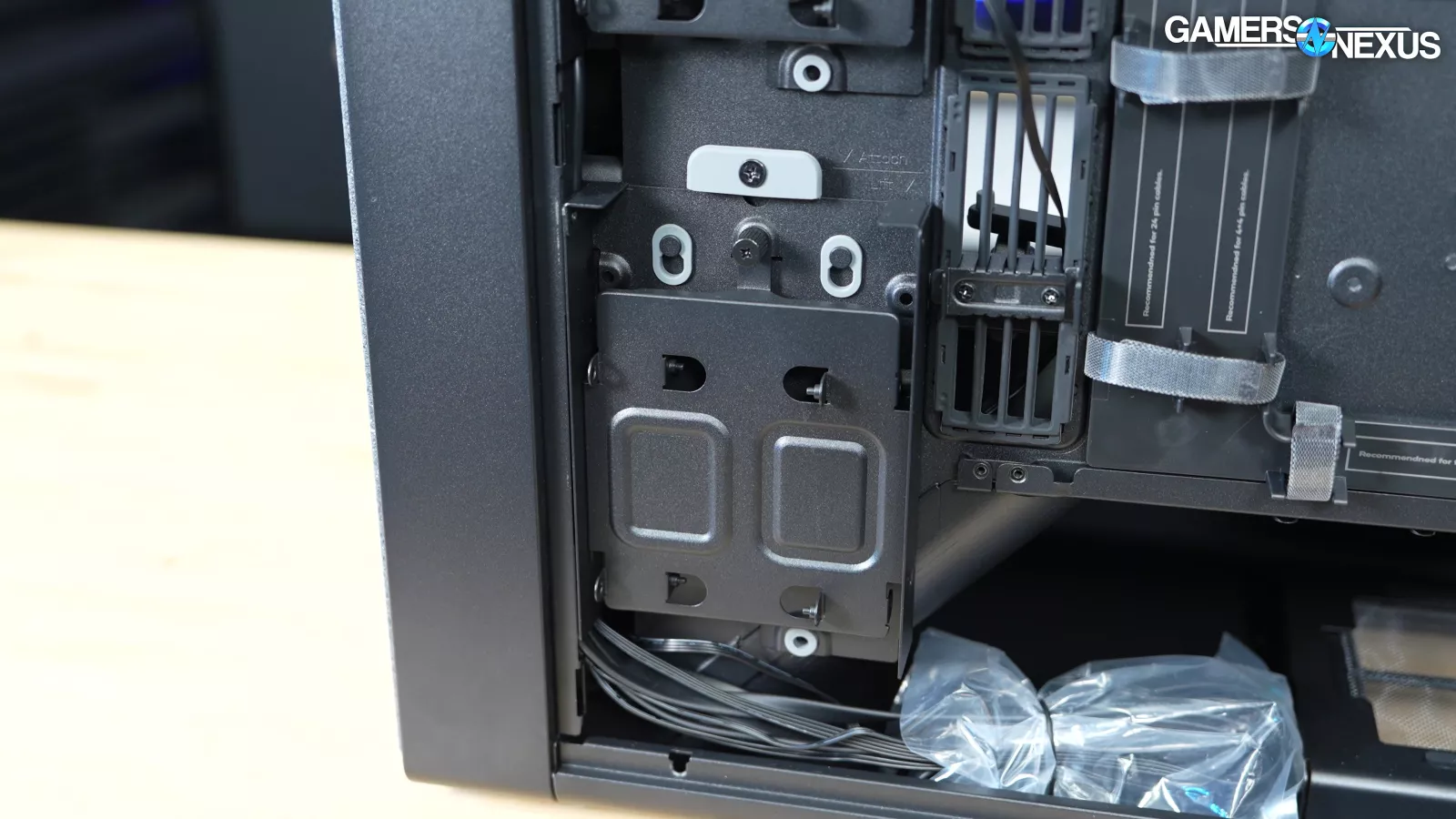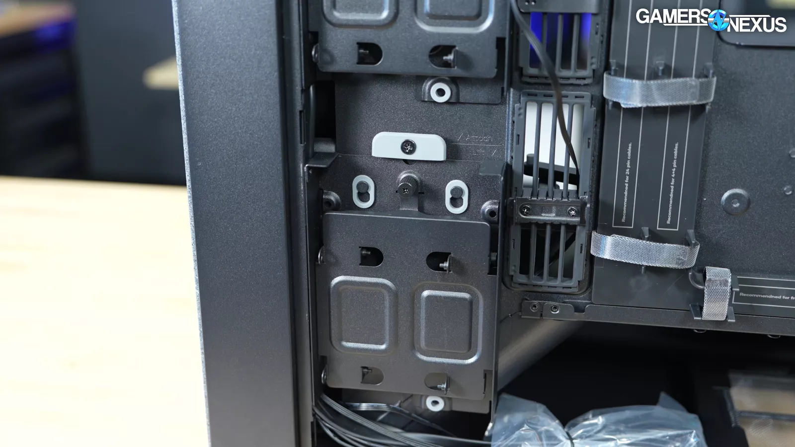 We're not sure how to feel about the trays for storage drives. They look like a nightmare to manufacture, with rubber grommets, rivets, studs, and a removable inner piece, but the end result is a completely normal drive capacity: four total 2.5" drives, or two total 3.5" drives. The two trays are mounted in the cable management area by default, but there's actually a third mounting location behind the motherboard tray that may be preferable if you want to free up room for cables.