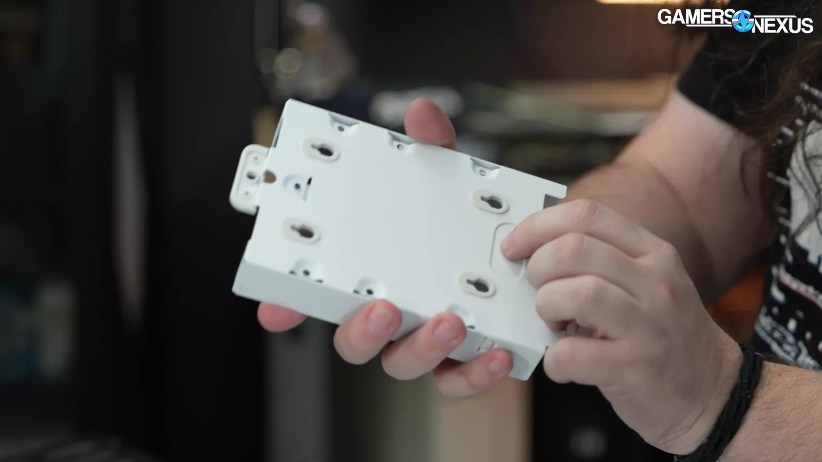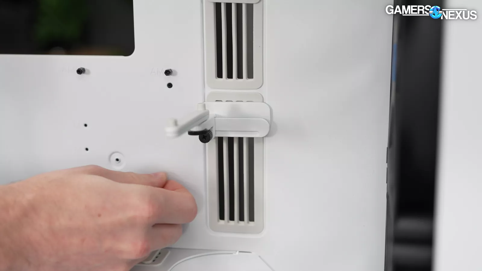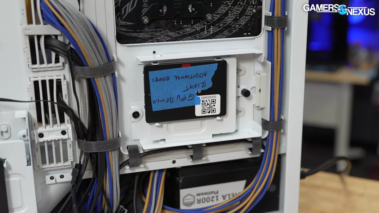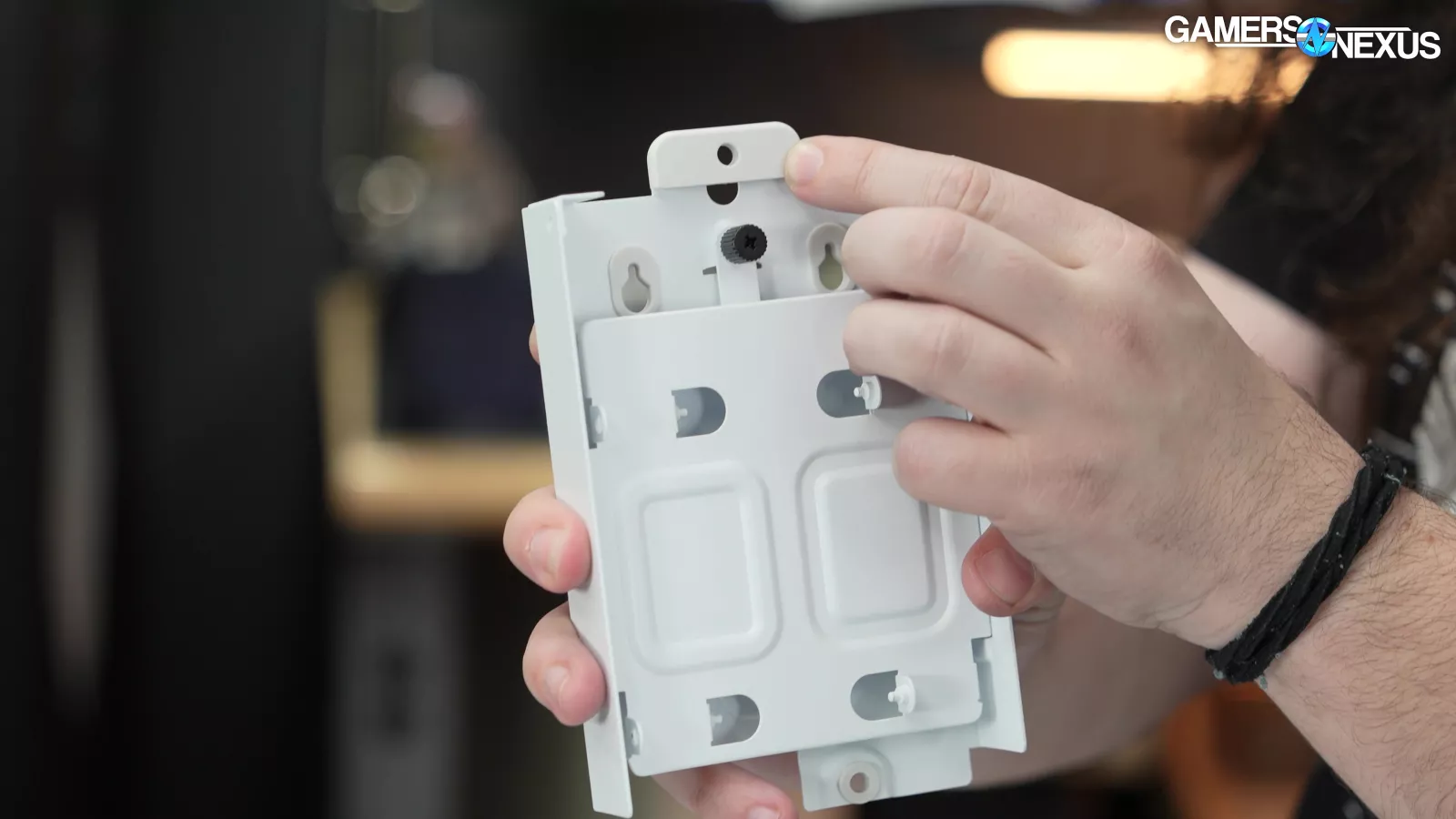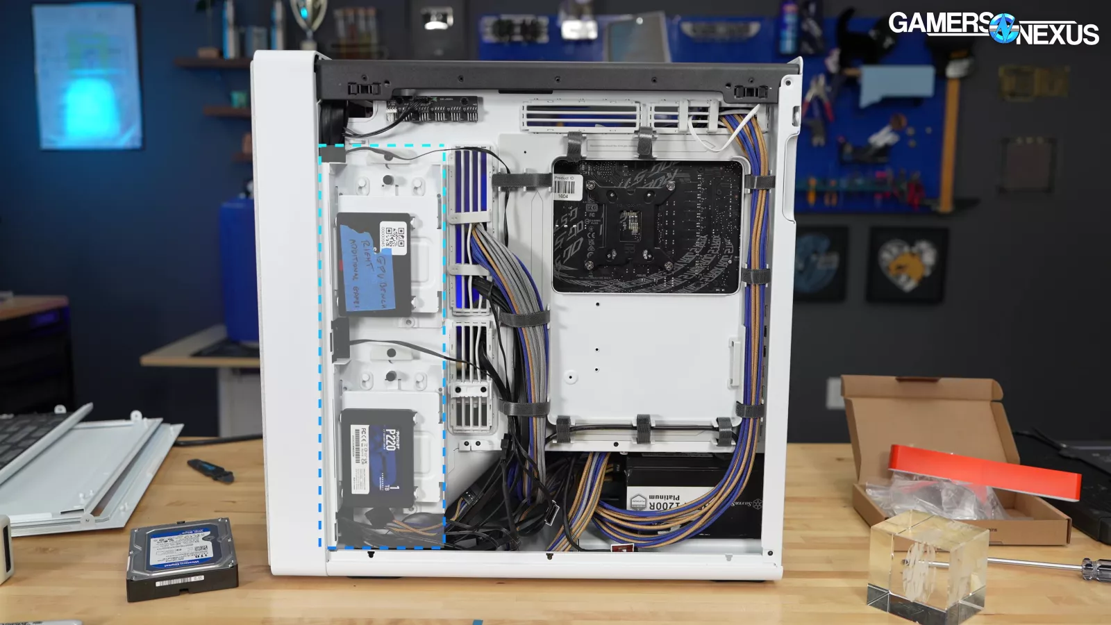 We're not sure how to feel about the trays for storage drives. They look like a nightmare to manufacture, with rubber grommets, rivets, studs, and a removable inner piece, but the end result is a completely normal drive capacity: four total 2.5" drives, or two total 3.5" drives. The two trays are mounted in the cable management area by default, but there's actually a third mounting location behind the motherboard tray that may be preferable if you want to free up room for cables.