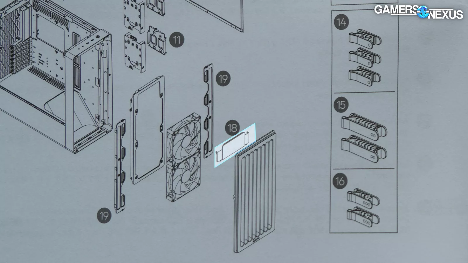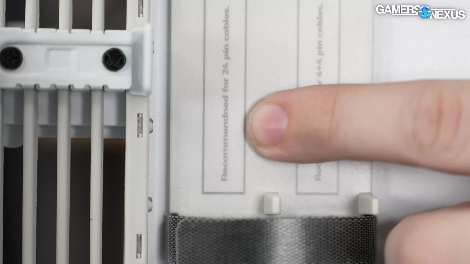 Inside the case, there’s a scoop. We've been calling these airflow scoops "toilet bowl" designs even though the NZXT H5 Flow is the only one that really looks like that. We've also seen examples from Fractal and Corsair, but unlike each of those, the "air guide ramp" at the front of the BF 360's PSU shroud is made of metal and is permanently attached with rivets. It’s also relatively flat, which HAVN’s thermal engineer says tested the best in their A/B testing. Usually scoops like this are removable for radiator compatibility reasons. The Flow doesn't claim any front radiator compatibility in the first place. When planning a build in the non-Flow, keep in mind that the front edge of the scoop is 8cm back from the front fan bracket, although that's plenty of room for conventional radiator and fan combos.