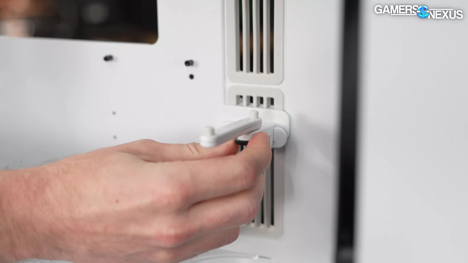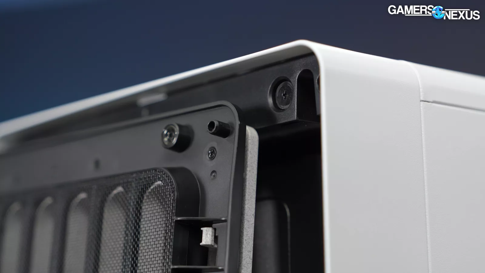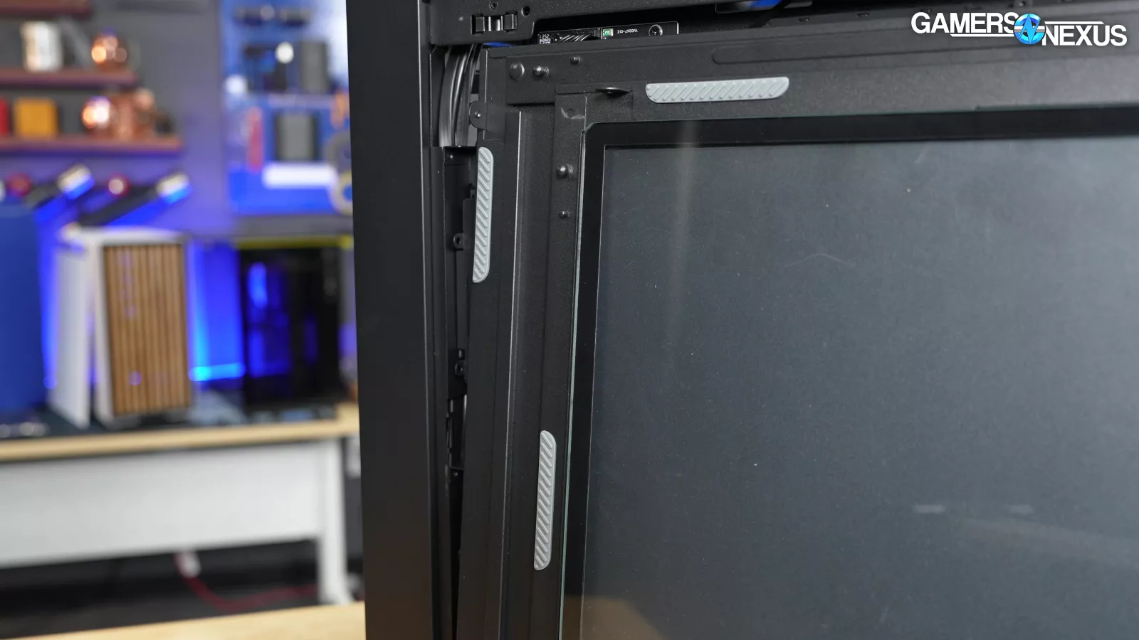 The front and top panels are held on with magnets, but all panels have additional screws to secure them during shipping. The glass side panel is beveled on each corner, and the plastic gutter that it seats in is shaped to match. Both side panels have metal studs on the top edge (in addition to the usual snaps) to make sure nothing sags out of alignment, which is similar to the strategy TRYX used for its L70 (read our review) update.