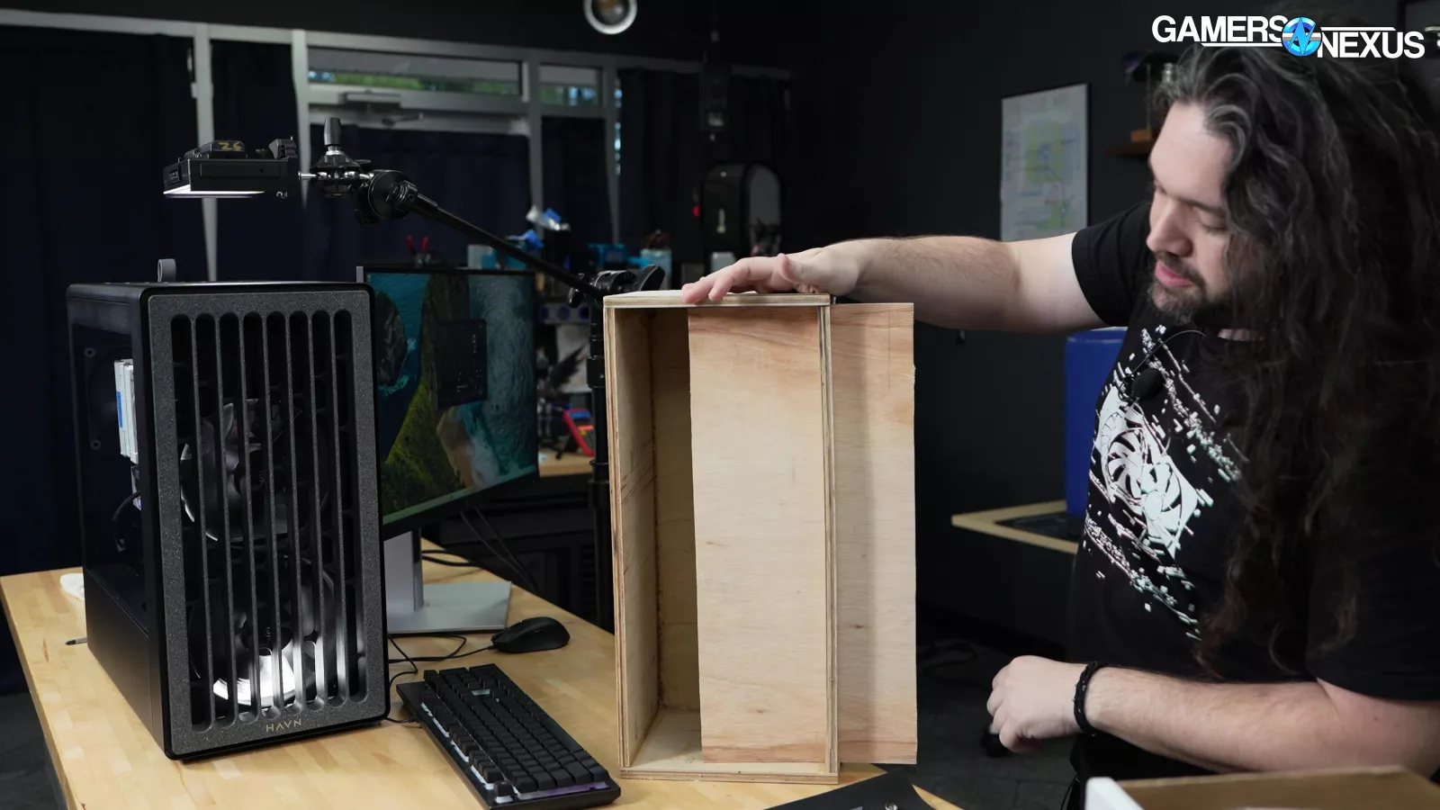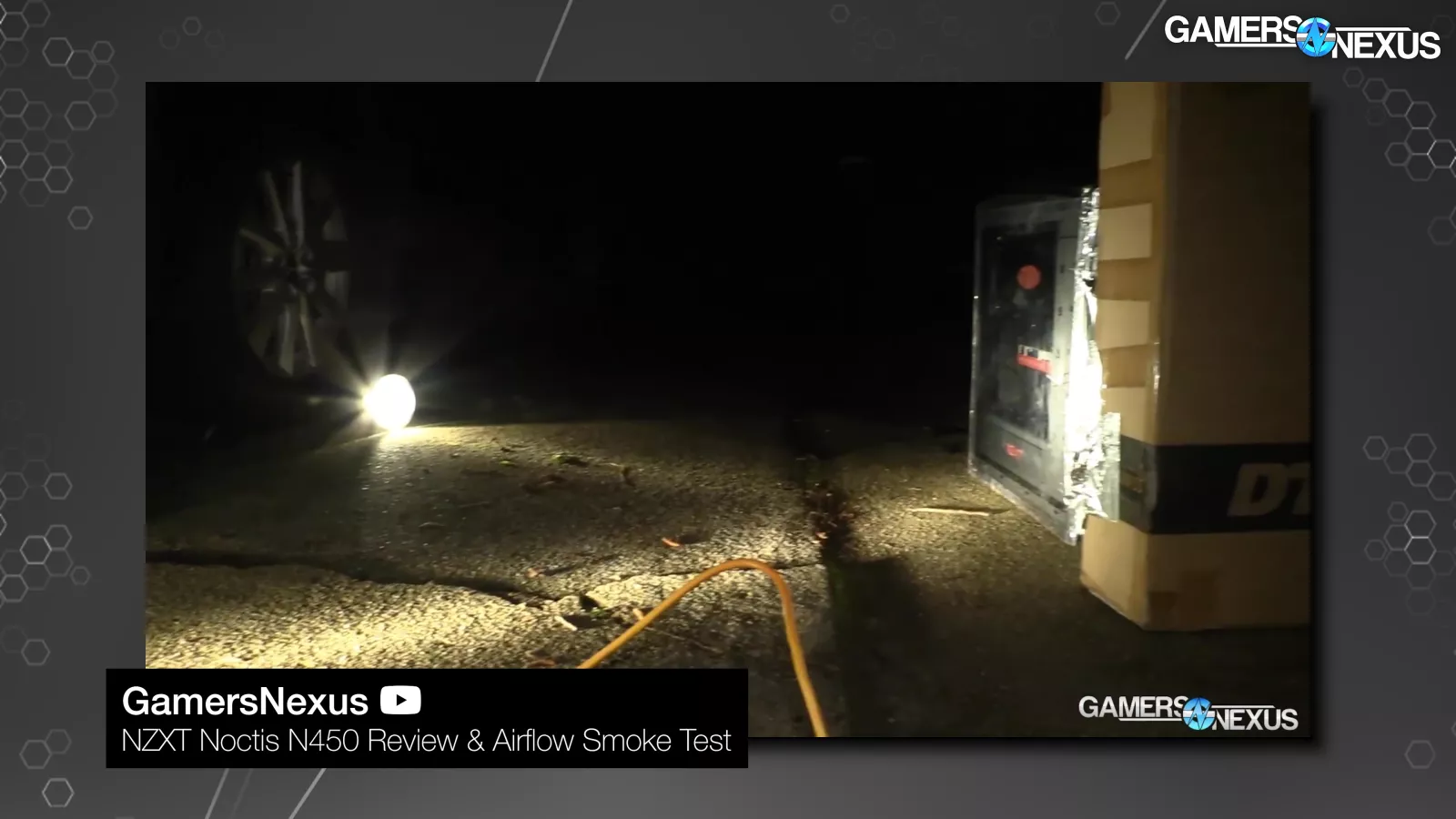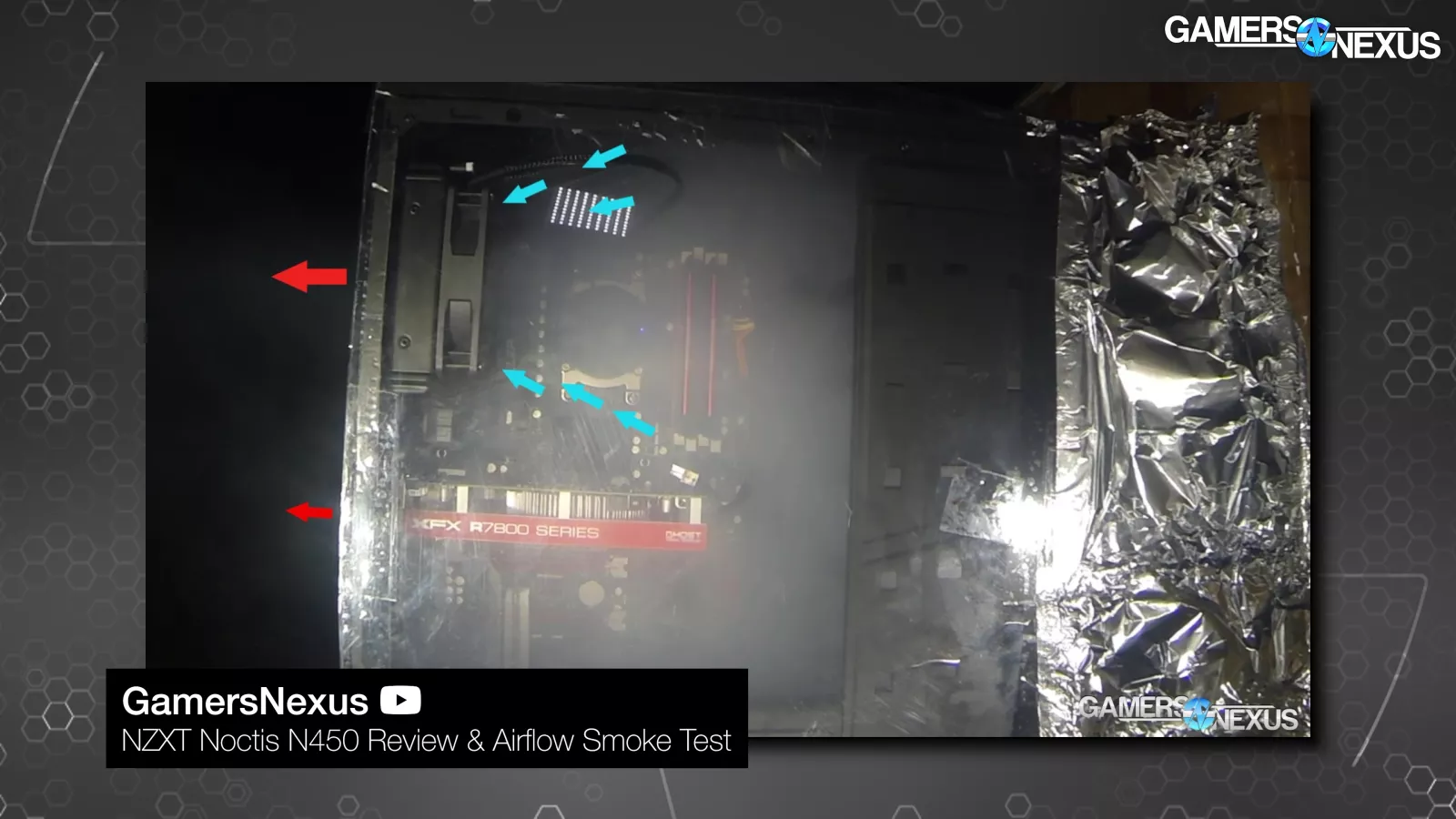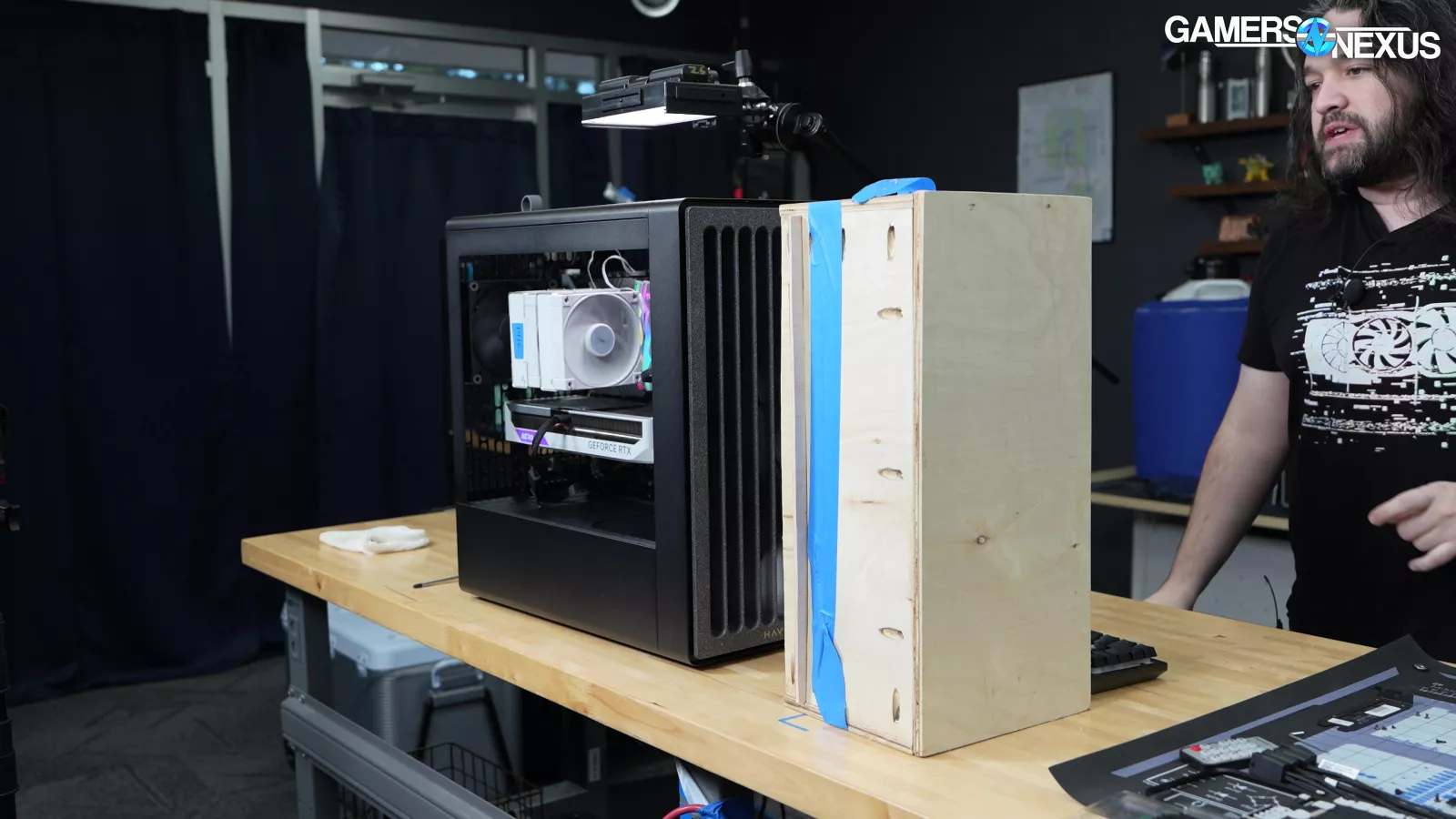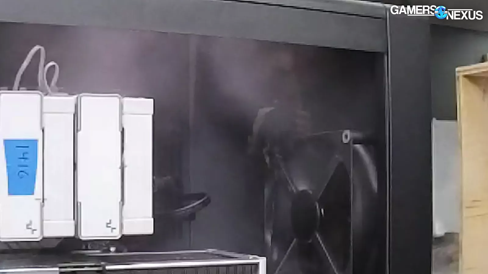 This new setup is a streamlined version of that old idea. We’ve built a semi-sealed box, which we put in front of the PC. It’s not perfectly airtight, but it’s close enough. From there, we fill it with fog from the top. The case is then left to pull in air on its own when we remove the panel, with minimal interference from us. That way, we’re not skewing the results by blasting smoke at specific points.