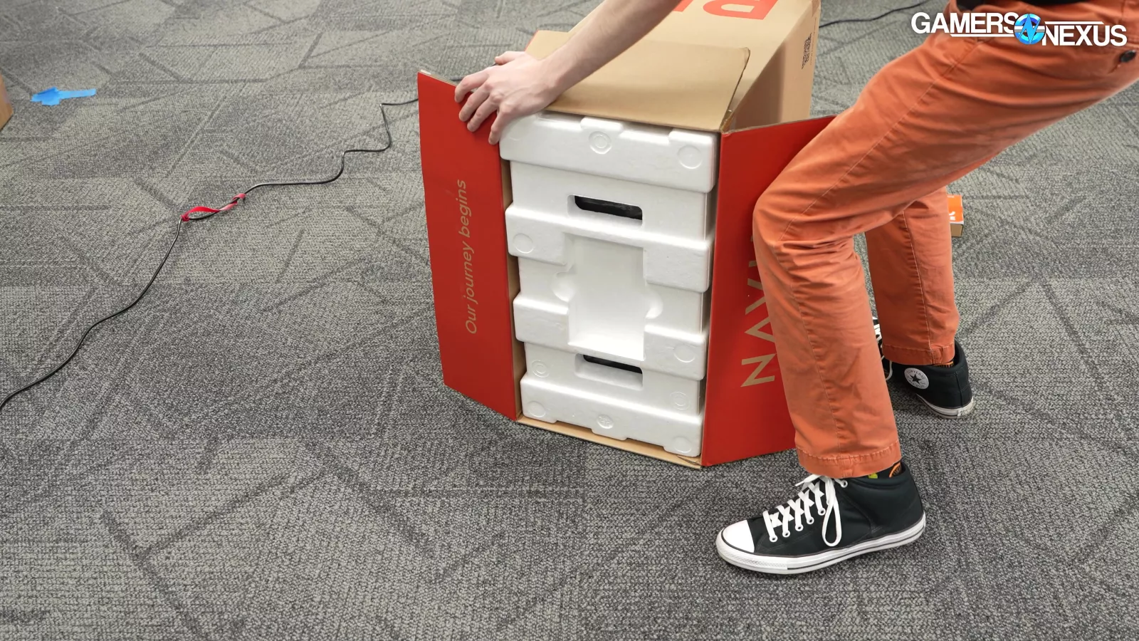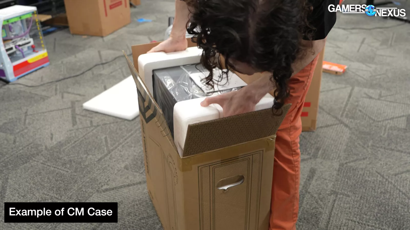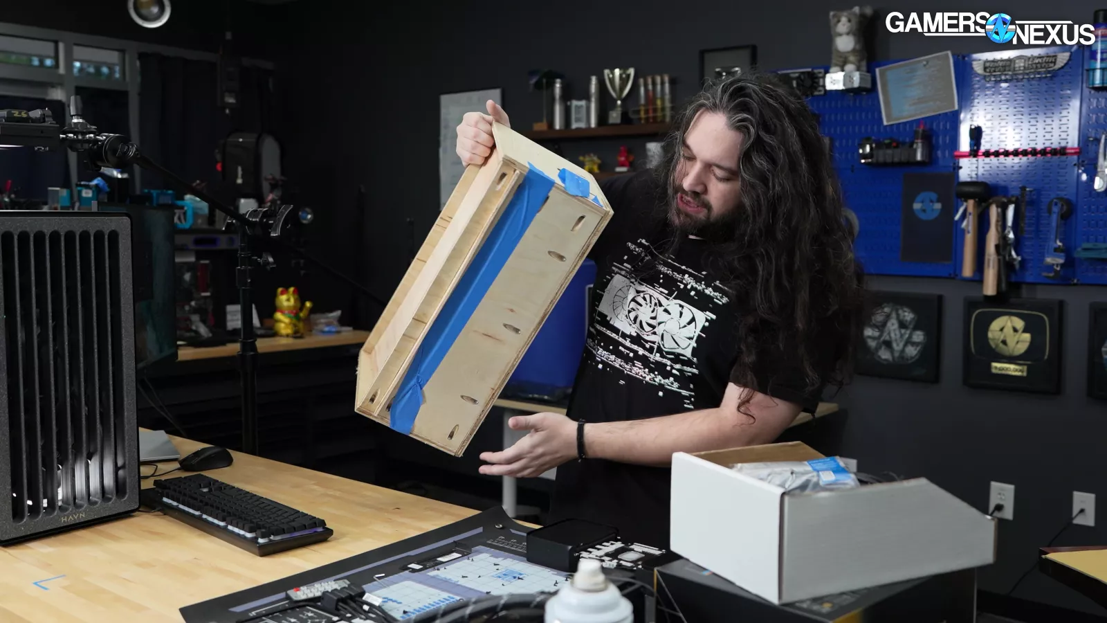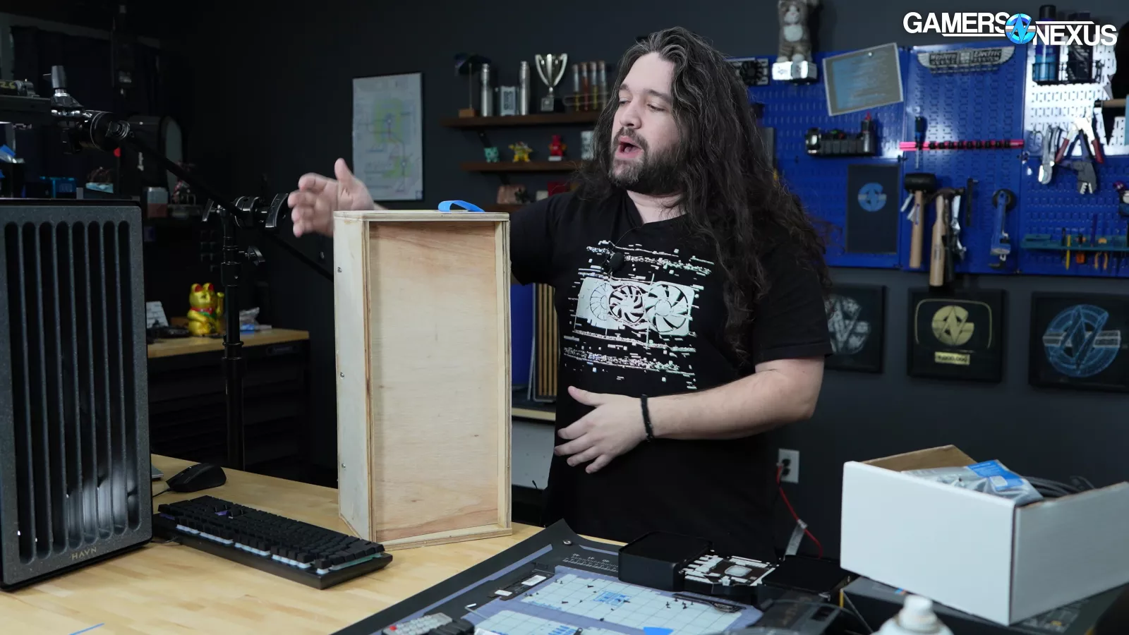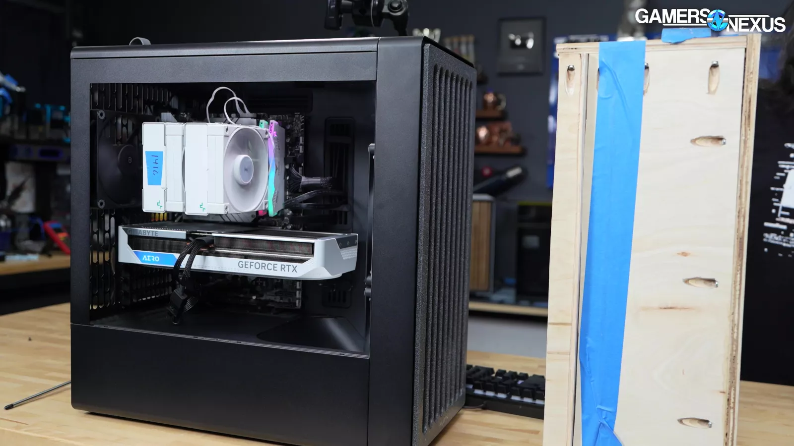 This new setup is a streamlined version of that old idea. We’ve built a semi-sealed box, which we put in front of the PC. It’s not perfectly airtight, but it’s close enough. From there, we fill it with fog from the top. The case is then left to pull in air on its own when we remove the panel, with minimal interference from us. That way, we’re not skewing the results by blasting smoke at specific points.