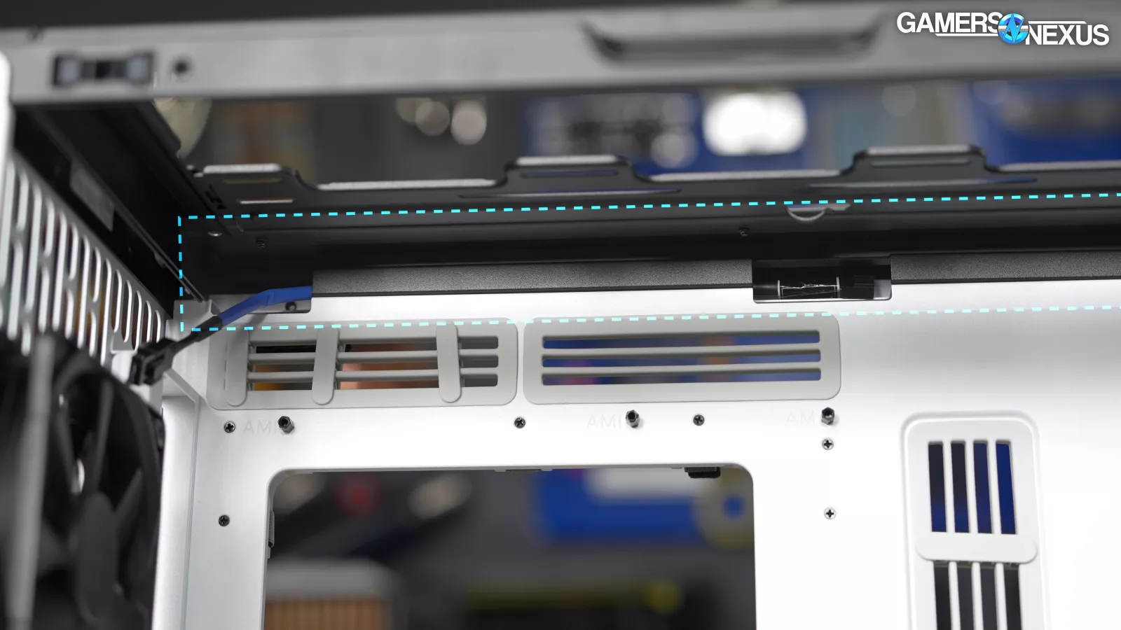 To match the scoop, there's an "Anti-Backflow Plate" that blanks out the part of the top fan mount above the 180mm front fans. "Backflow" in this case would mean air flowing out of the case through the gap and recirculating into the front fans, reducing their cooling effectiveness.