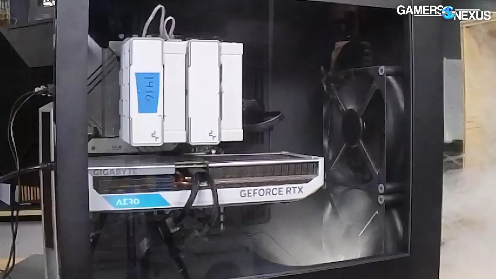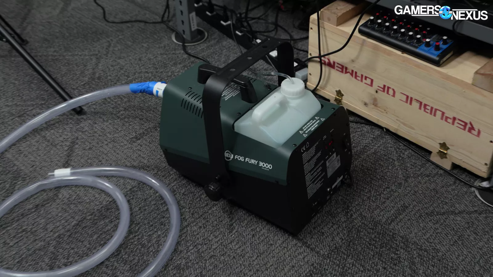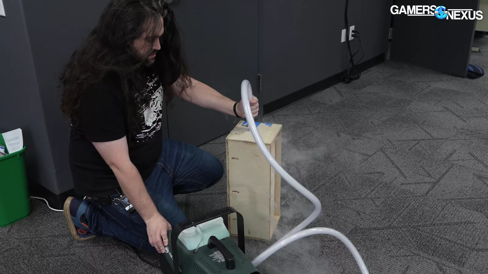 For this round, we’re using a fog machine instead. The fog is safer, but it comes with a tradeoff: residue. Fog oil coats everything it touches, leaving a thin, greasy film on all the components. The system will still run fine electrically, but it’s gross and isn’t something you want on your main test hardware. Because of that, we’re using a different PC for smoke testing instead of one of our benchmark systems.
