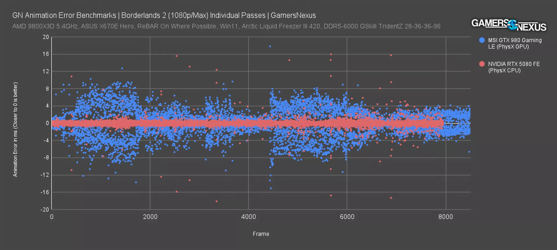 These two results are from our piece about the death of 32-bit PhysX. These two particular results were fairly close together both in terms of average FPS and lows: the GTX 980 with GPU PhysX averaged 101 FPS across multiple passes and the RTX 5080 (read our review) with CPU PhysX averaged 95 FPS. These are real results and we explained them in our piece about NVIDIA killing 32-bit PhysX support this year.