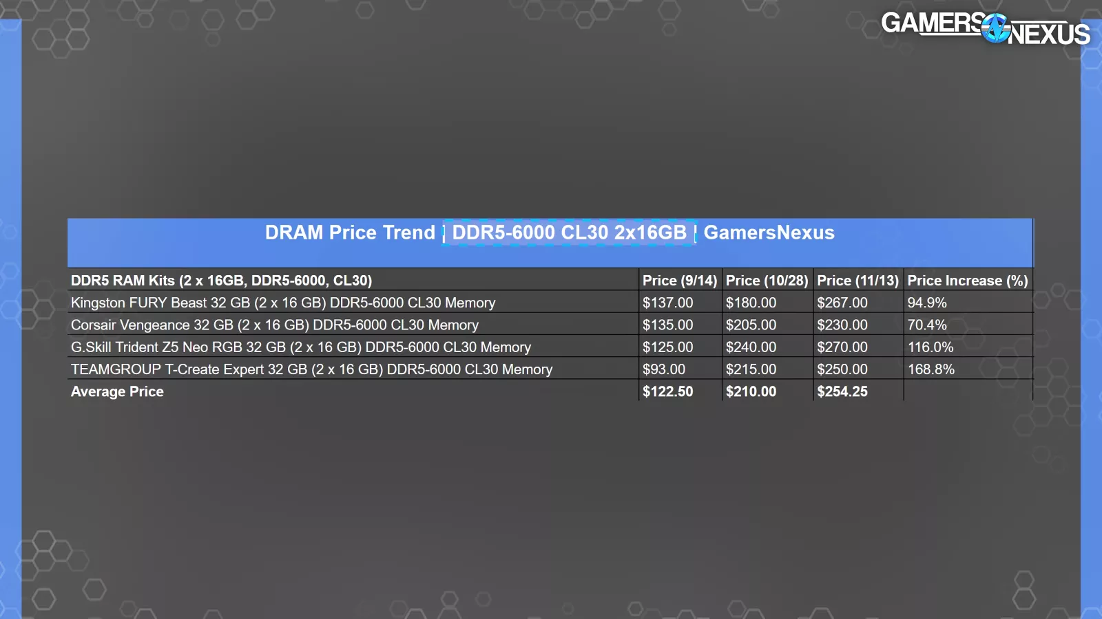 This table focuses on kits of 2 x 16GB DDR5-6000 CL30, with one kit each from four of the largest vendors. This table includes each listing’s Newegg price in mid-September, which is prior to the most apparent price increases, and then again in November.
