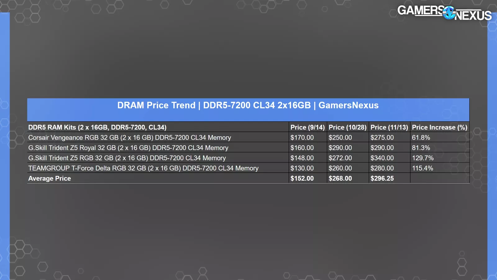 In some of our price checks today, we found memory kits increasing by 169%, 116%, 181%, and similar. By hard dollar amount, some of these have gone up by 100s of dollars for a kit of 32GBs in a span of just one to two months. Higher capacities have gone up by $400 or $500 in some cases. At one point, we observed a 1% increase per day for 13 days. There’s even new reports that these recent price increases are to blame for NVIDIA’s potentially delayed unannounced Super Series refresh with worries that the company will prioritize denser GDDR7 modules for workstation GPUs.