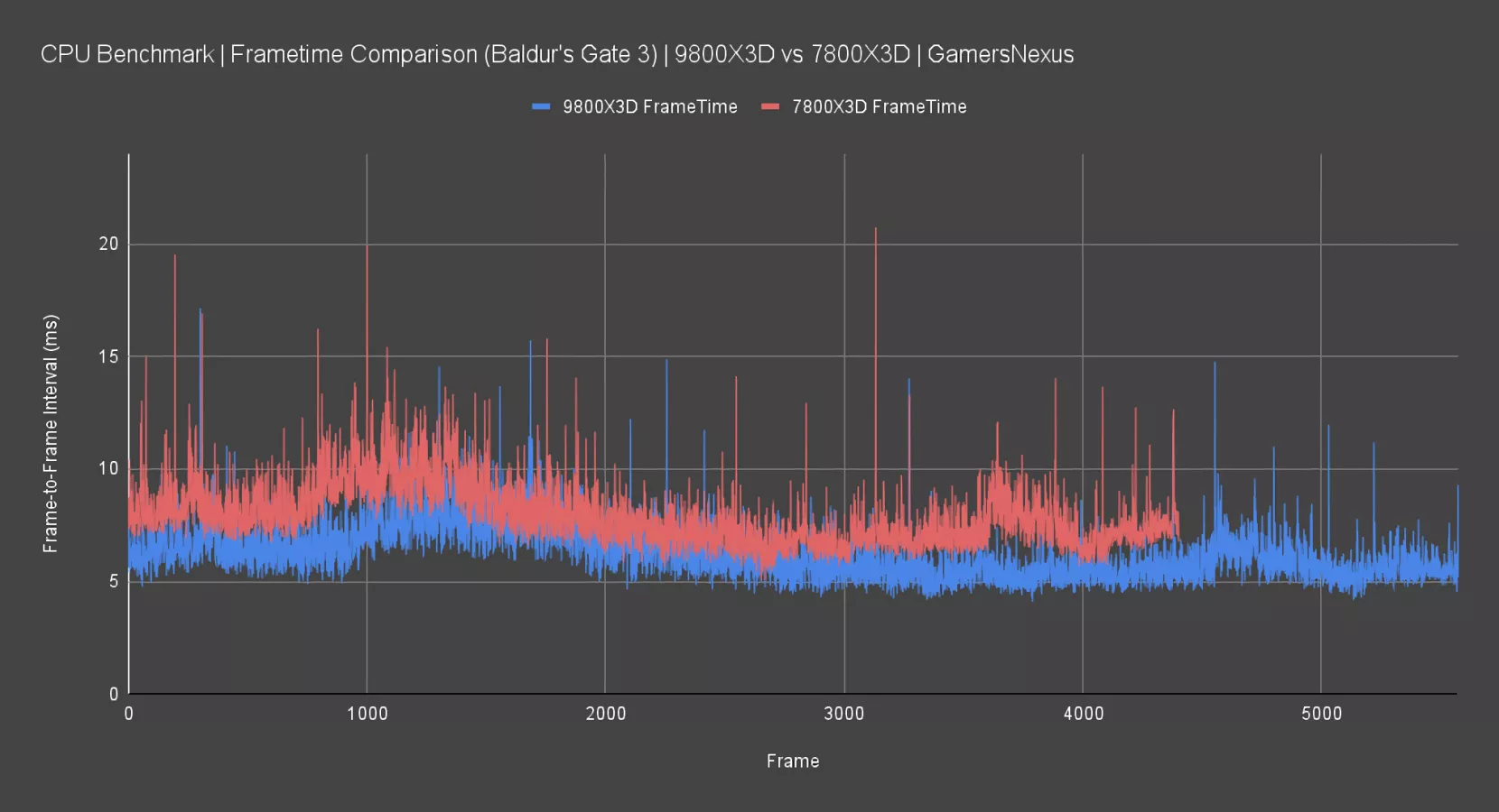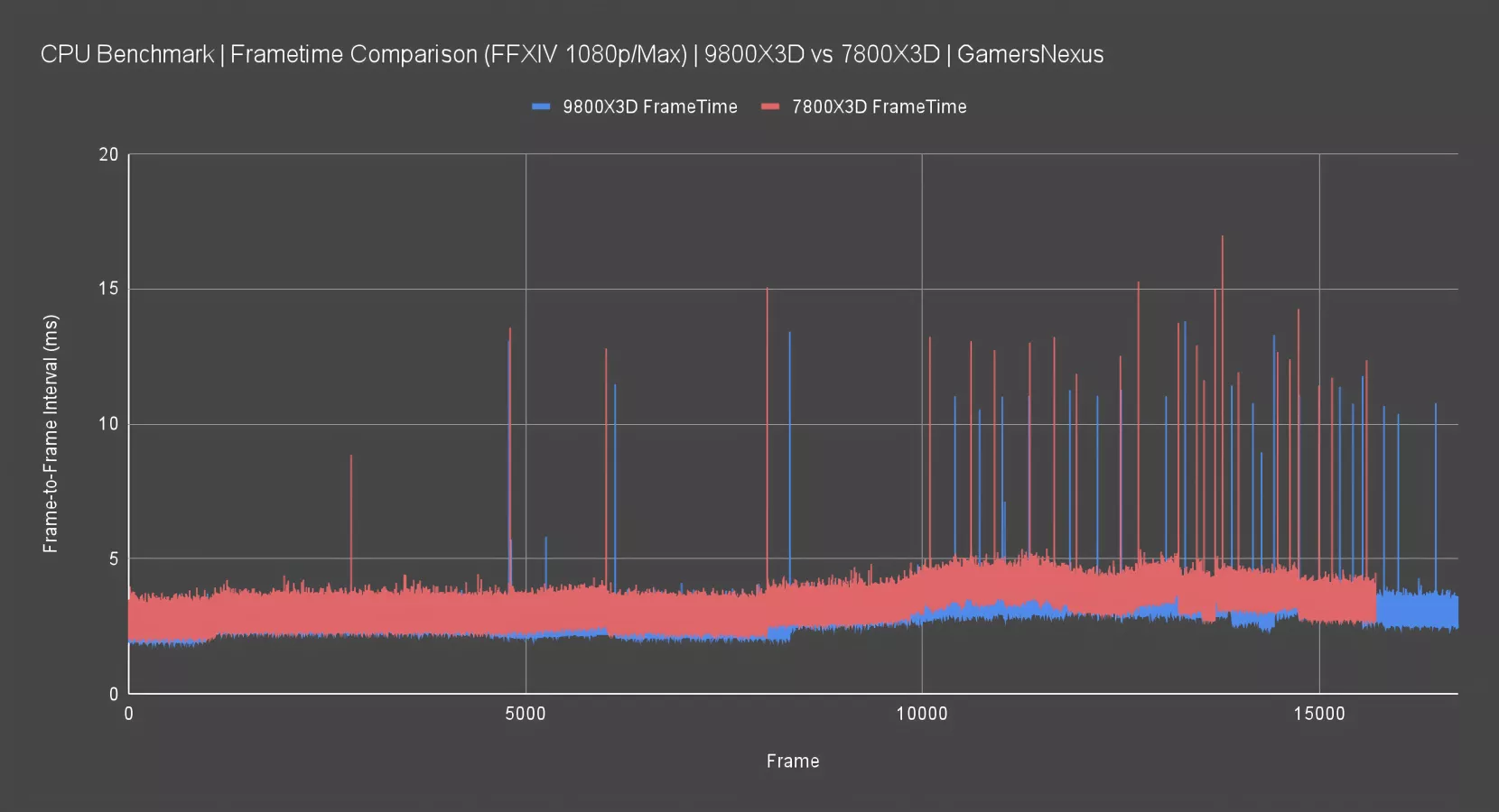 For frametimes, we observed overall similar frame-to-frame intervals for the 9800X3D and 7800X3D. Typically, they oscillate between 2ms and 4ms intervals, where 16.667ms would be 60 FPS. The spikes are what matter: The 9800X3D in this title has slightly shorter excursions from the mean than the 7800X3D. The difference is hardly perceptible, but on a technicality, the 9800X3D does deliver more consistent frametimes in this title.