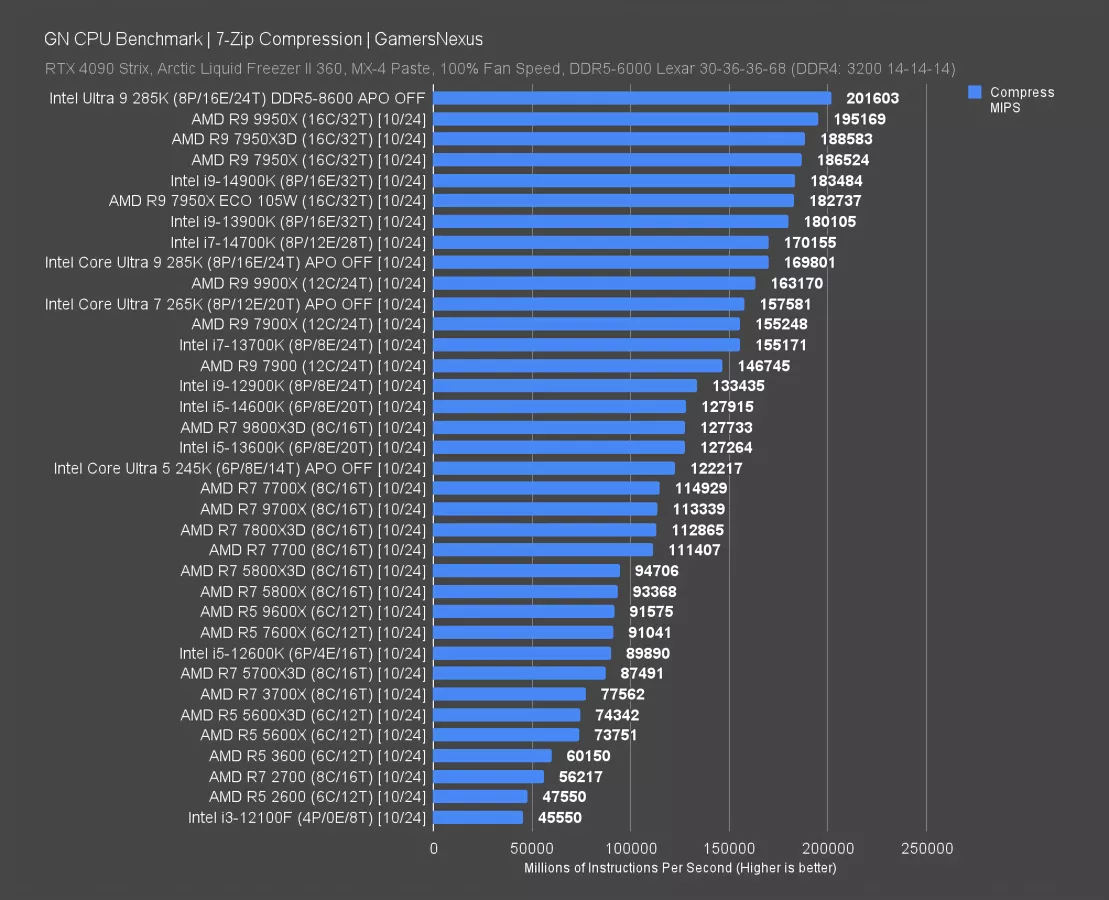 Intel’s 265K outperforms the 9800X3D by 6.6%, with the 7950X (watch our review) a bit above that. The 285K does impressively well in this specific test, with the 14900K alongside it.