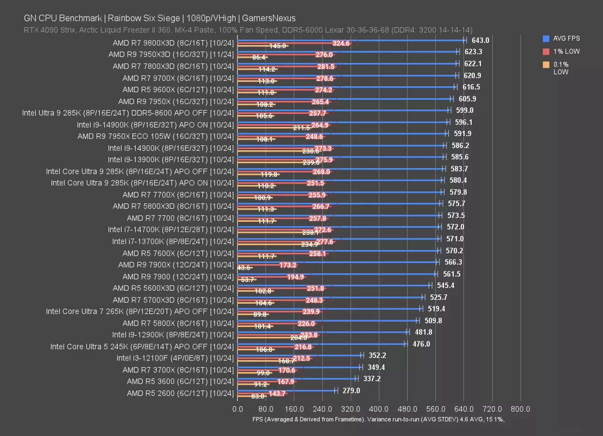 We removed some other CPUs from this one to make space for APO on results. As a reminder, APO is now doing little for performance in any of our tests. This includes Rainbow Six, which previously saw larger impact. The 14900K is about 10 FPS different with APO on. The 285K saw change only within error and run-to-run variance so it’s irrelevant.
