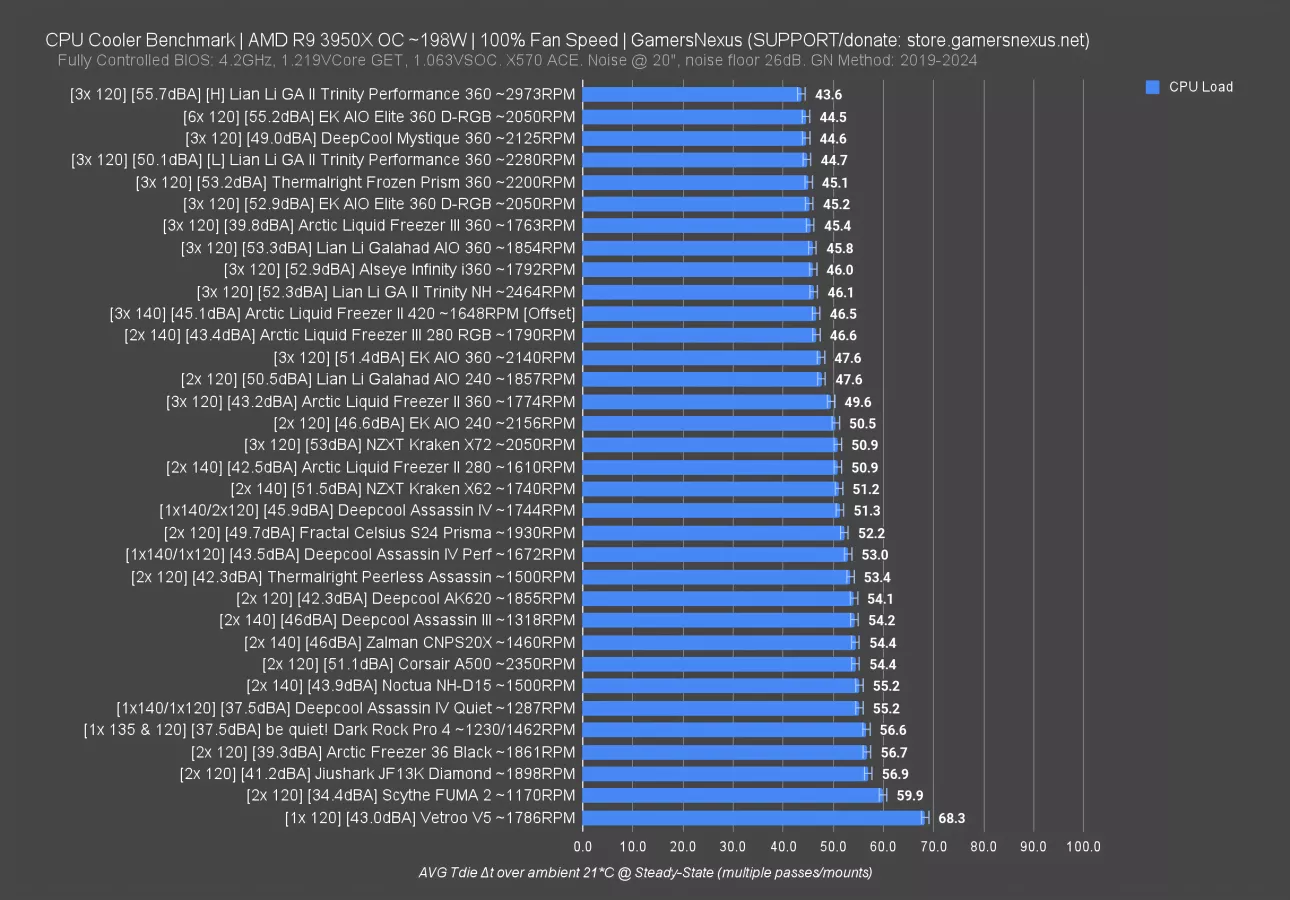 Anyway, the Frozen Prism is about equal to the Liquid Freezer III when it’s in a reduced 280mm size. The closest air cooler on this chart is Thermalright’s own Peerless Assassin (watch our review) at 56 degrees, pushed below all the liquid coolers.