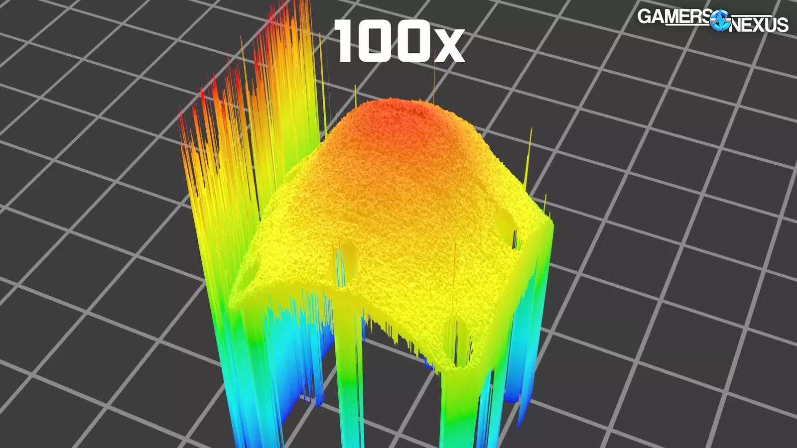 For the Thermalright Frozen Prism, you can see at 1x zoom, the central area is curved toward the laser, which is indicated by that red part of the heat map. That’d make it convex toward the CPU, which is typically concave for Intel CPUs. We showed this in our IHS scans previously for the Scythe content.
