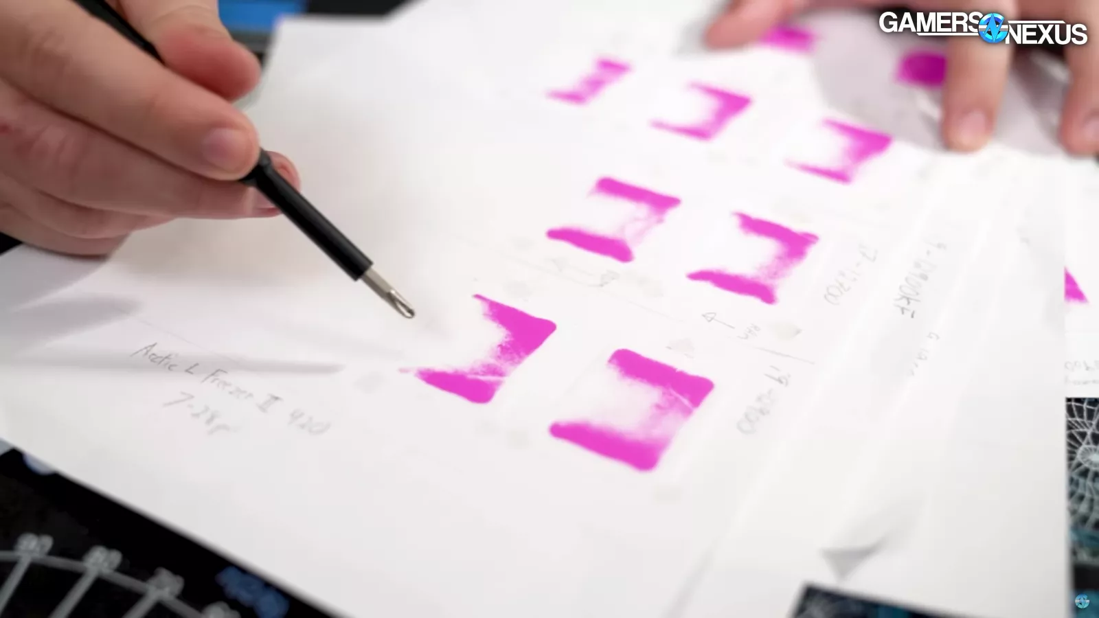 On Intel, the pressure scans showed good contact across the center channel of the IHS. It’s lacking on the far sides nearest the ILM clamp points, but the cold plate is making good contact everywhere the silicon is present. This high pressure across the die area likely explains the performance we saw earlier -- that plus the louder fans when at 100% load.