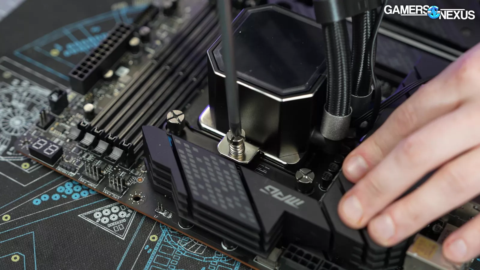With the thermal paste applied, it’s time to place the cold plate down onto the IHS and tighten both screws.