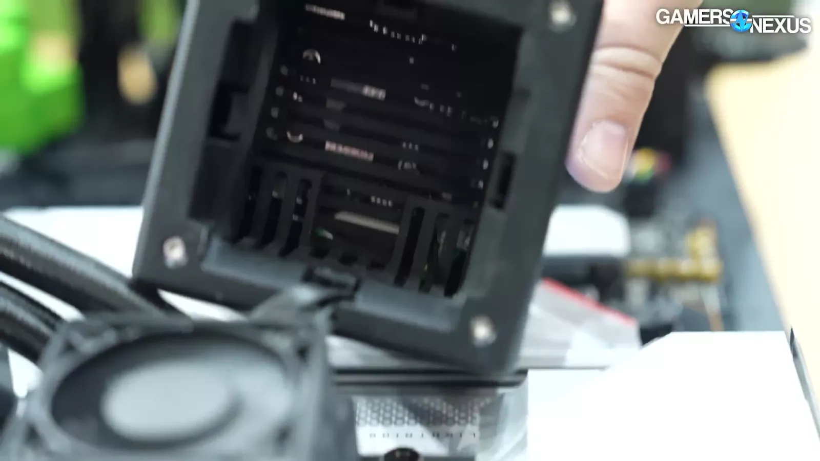 Looking inside the TR300, we can see a lot of Yeston-inspired marketing material on the pump block. In addition, the case also has a closed-off side near its front that tries to obscure the power supply and its cables because the PSU is mounted to the front and is rotated on its side. Unfortunately, this design does limit options for intake fans in the front. The case relies on bottom intake fans and some on the side. Again, unfortunately, the bottom of the TR300 is not that elevated though the TR200 does have more room to breathe, which we liked seeing.