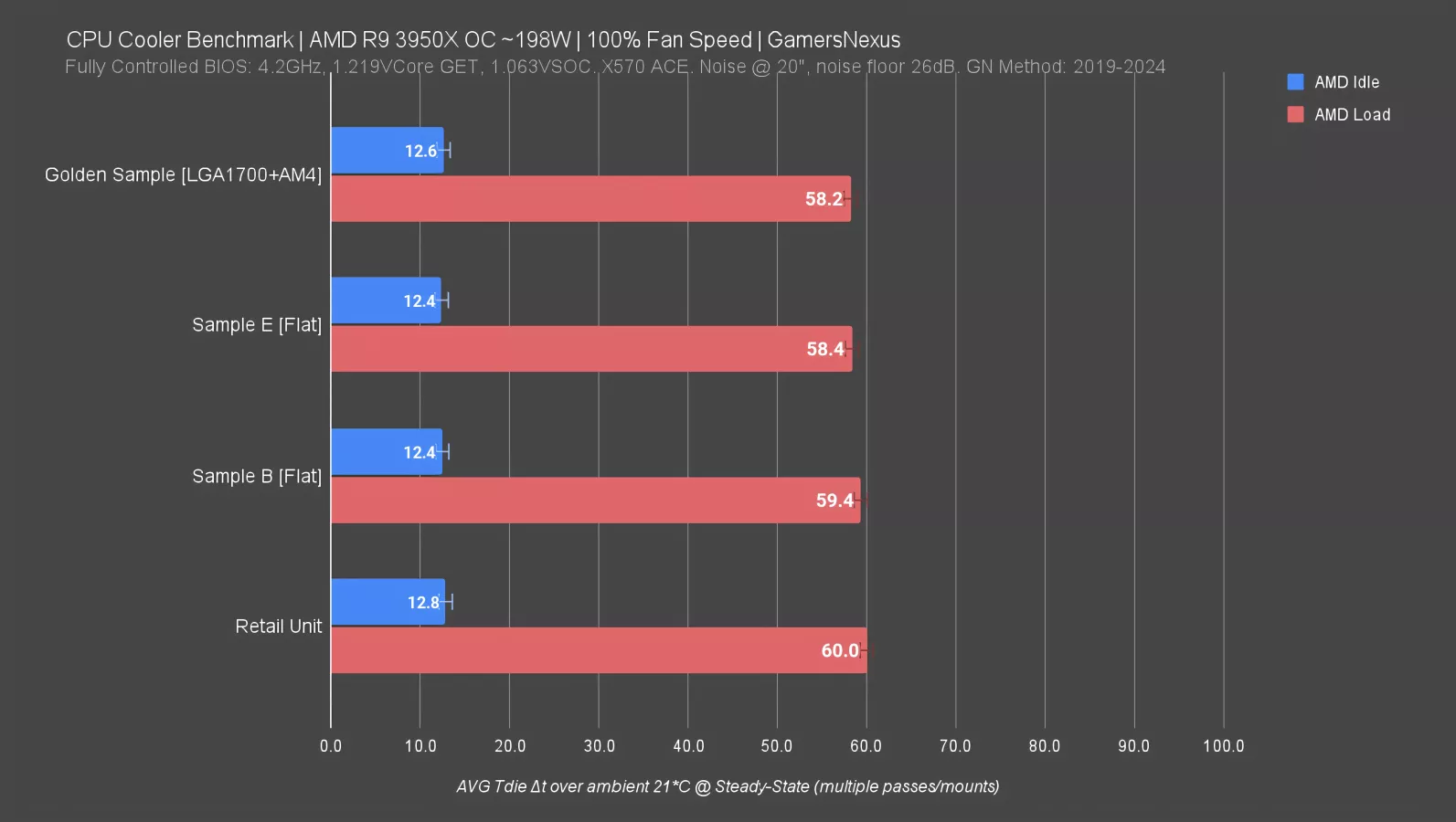 And all of that brings us to our thermal testing, where we’ll finally get around to evaluating a long-running weak point in cooler reviews. When a cooler review only considers one IHS style, it’s possible that the cooler performs better on the other. We’ve been open about this weakness for years but made the decision to go with one platform since a proper review takes so much time. But a few months ago, we added Intel to our cooler test suite to accommodate both styles. Now we get to show you why we did that.